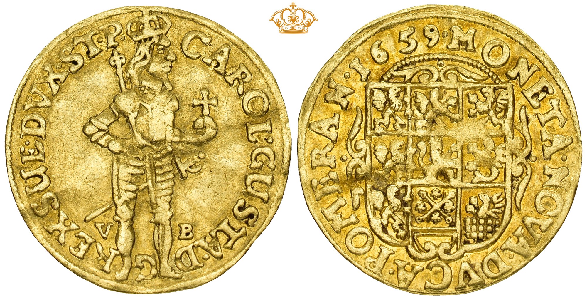 Dukat 1659, Stettin. 3,37 g. Myntmester Ulrich Butkau. Den kronede og pansrede kongen står mot høyre med sverd, bærende septeret over høyre skulder, og med rikseplet løftet i venstre hånd / Ornamentert, ni-feltet våpen for Pommern. Ubetydelig spor etter montering på randen, lett buklet.