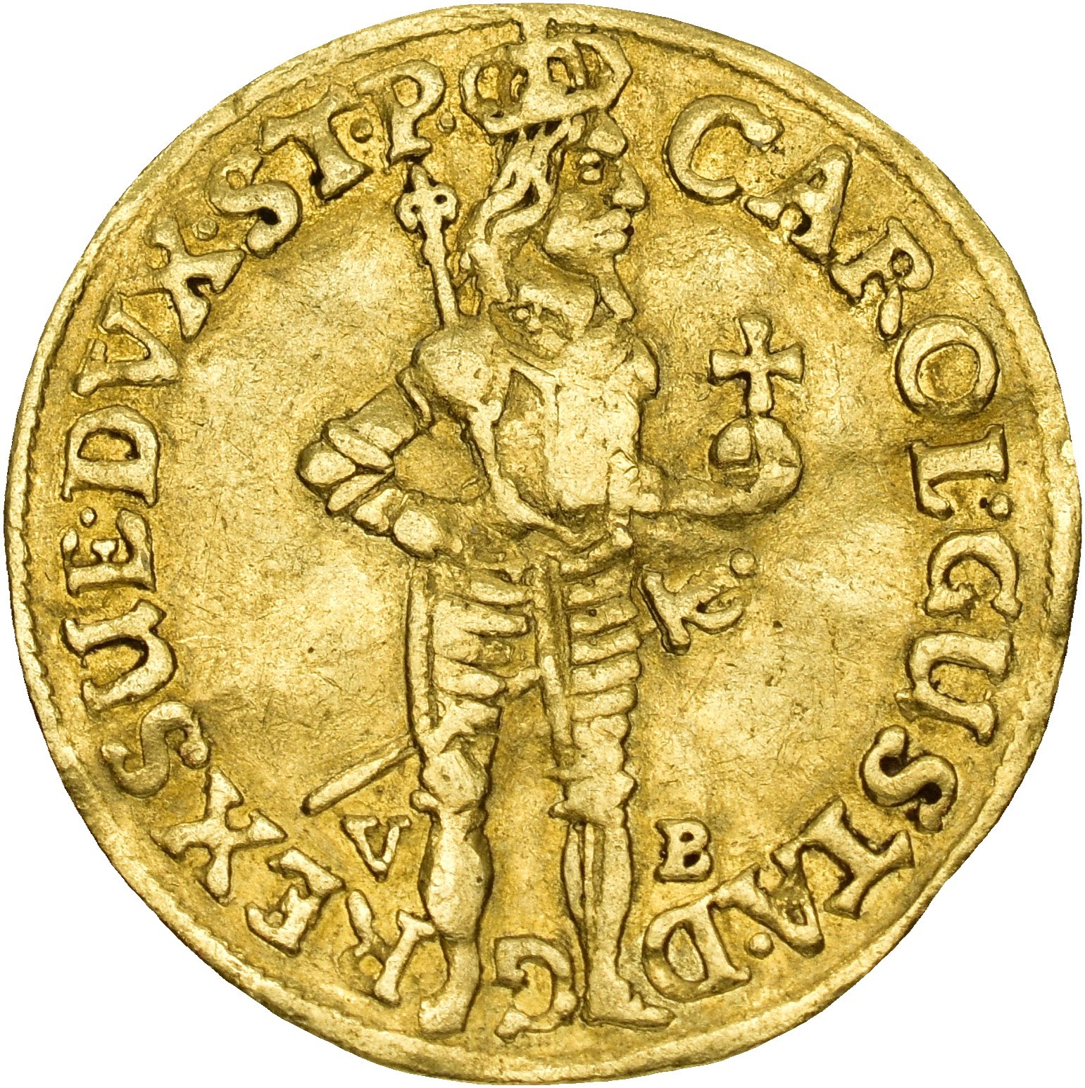 Dukat 1659, Stettin. 3,37 g. Myntmester Ulrich Butkau. Den kronede og pansrede kongen står mot høyre med sverd, bærende septeret over høyre skulder, og med rikseplet løftet i venstre hånd / Ornamentert, ni-feltet våpen for Pommern. Ubetydelig spor etter montering på randen, lett buklet.