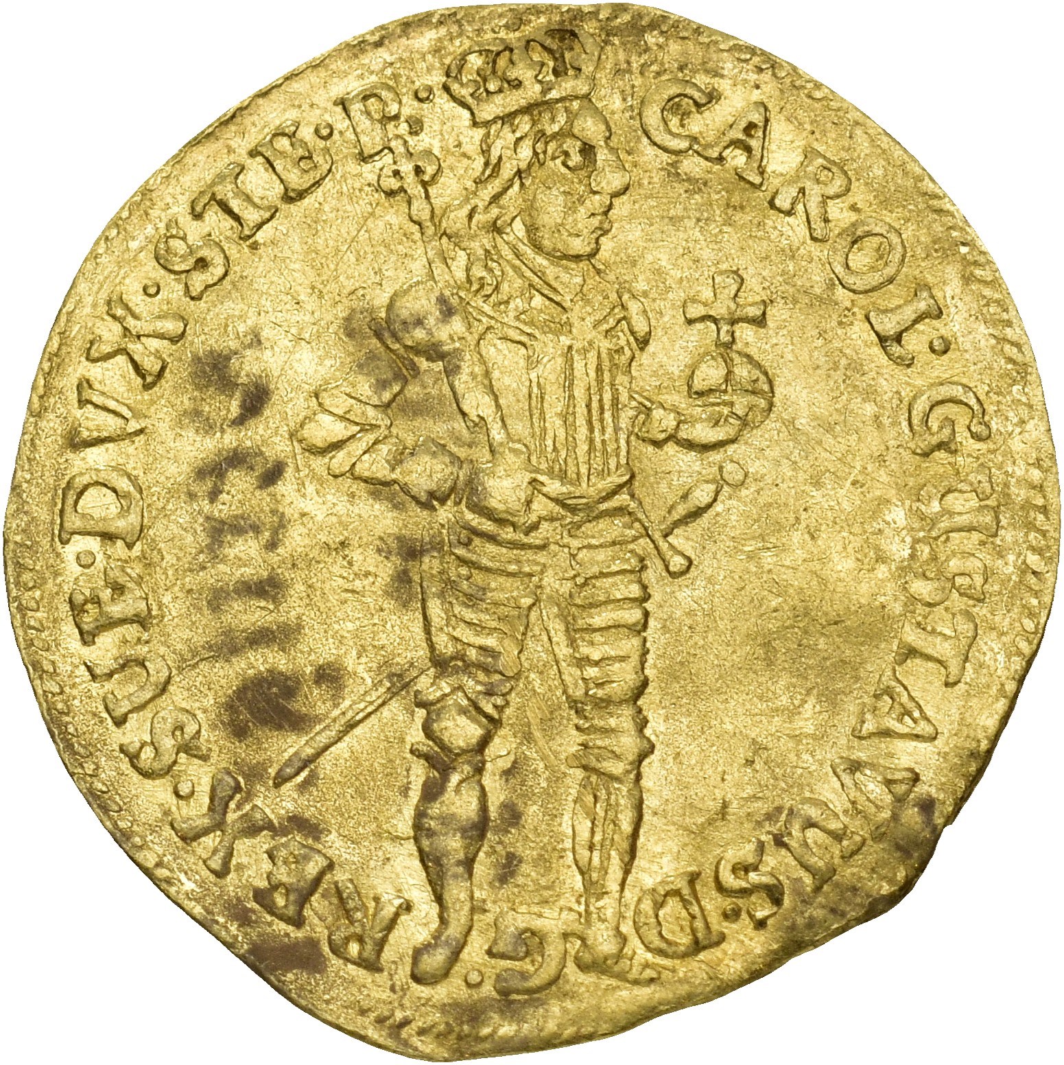 Dukat 1654, Stettin. 3,37 g. Uten myntmestermerke. Den kronede og pansrede kongen står mot høyre med sverd, septeret hvilende over høyre skulder, og rikseplet i venstre hånd / Ornamentert, ni-feltet våpen for Pommern. Minimale beleggrester. Very Rare