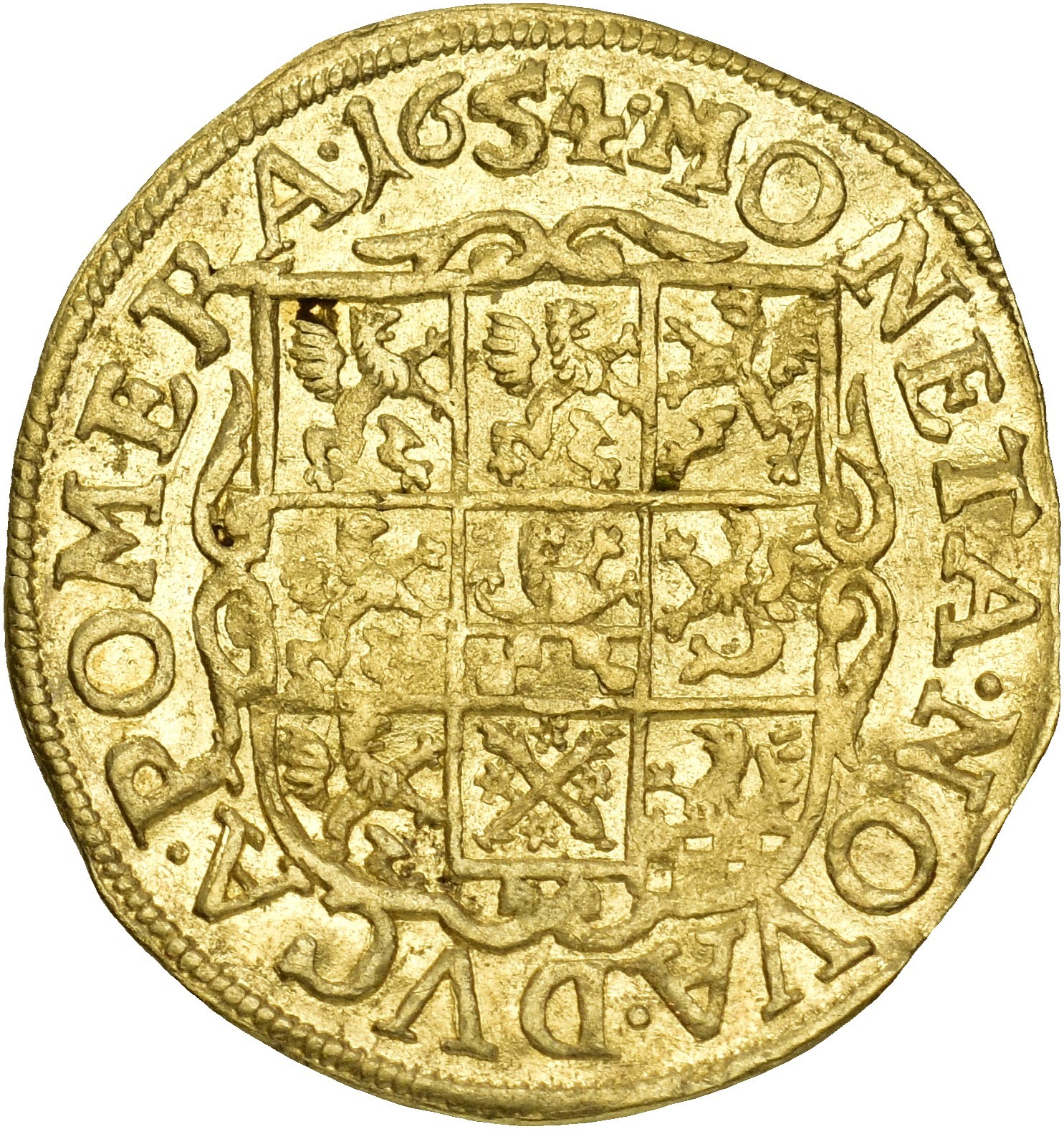 Dukat 1654, Stettin. 3,37 g. Uten myntmestermerke. Den kronede og pansrede kongen står mot høyre med sverd, septeret hvilende over høyre skulder, og rikseplet i venstre hånd / Ornamentert, ni-feltet våpen for Pommern. Minimale beleggrester. Very Rare