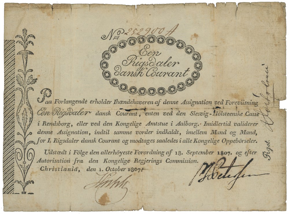1 rigsdaler courant 1807. No. 252900A. Noen mindre rifter, samt hull og flekker/some minor tears, as well as holes and stains.
