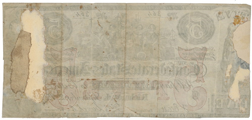 Confederate States of America. 5 dollars 1861. No. 364, plate C. Contemporary counterfeit. Has been mounted.