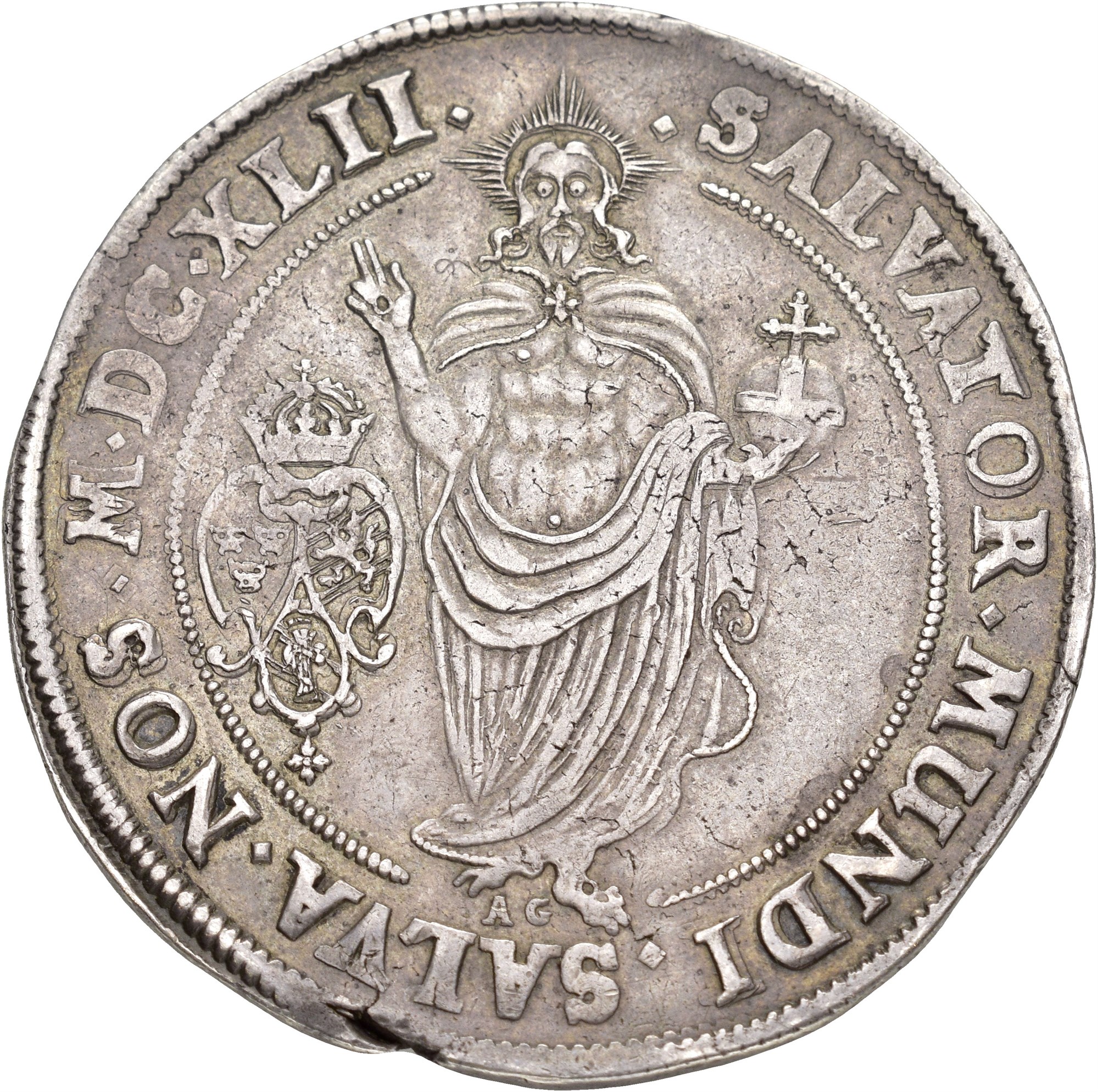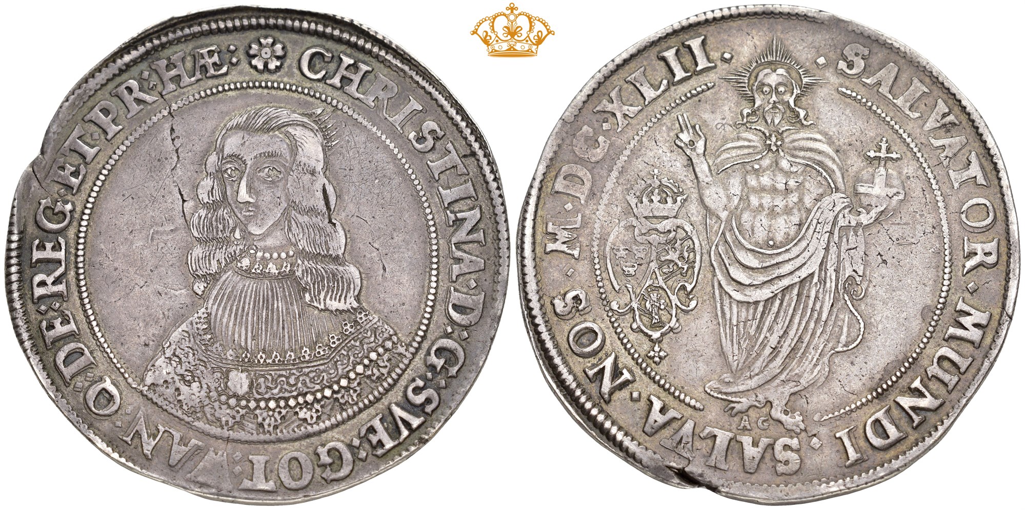 Riksdaler 1642, Stockholm 28,50 g. Med myntmerke AG under føttene til Salvator Mundi / With mintmark AG beneath the feet of the Salvator Mundi.