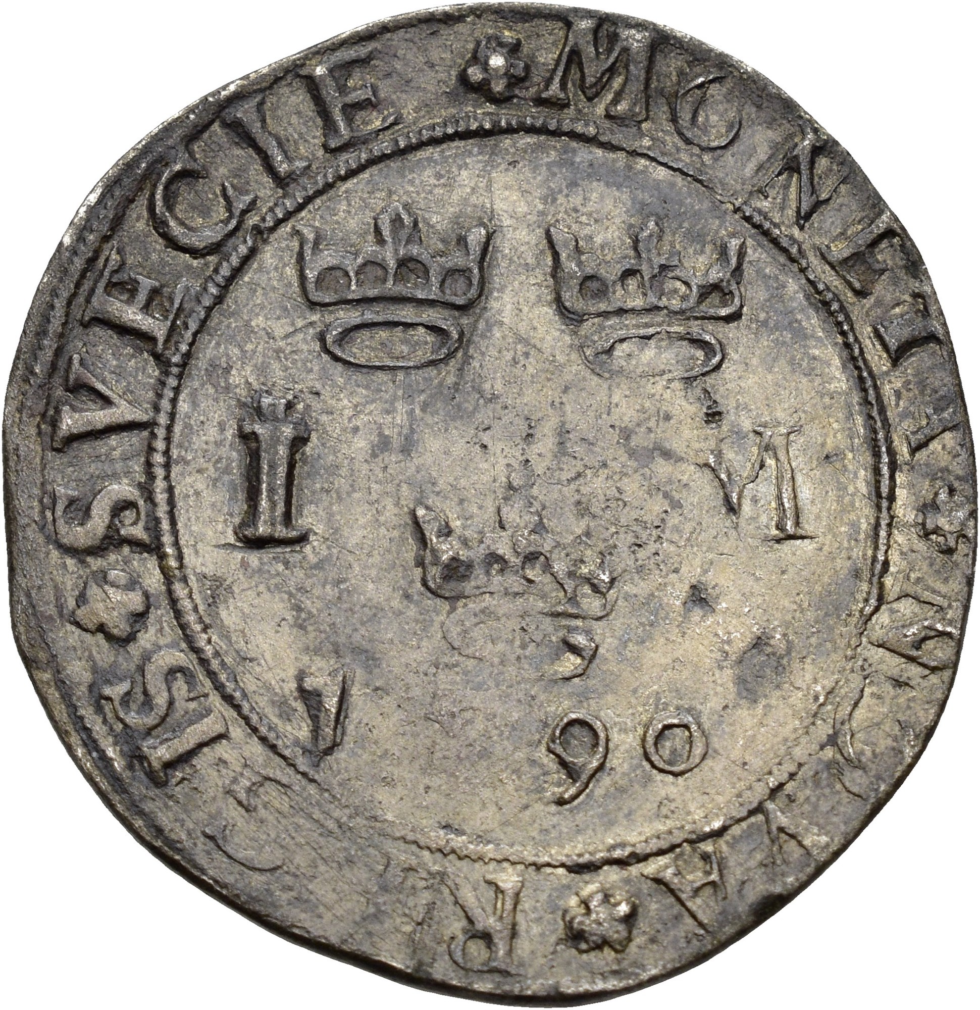 Mark 1590, Stockholm. 6,98 g. Type B linjene går fra øverst til høyre til nederst til venstre / lines from top right opp, to bottom left. Delvis svakt preget / partly weak struck. Very rare