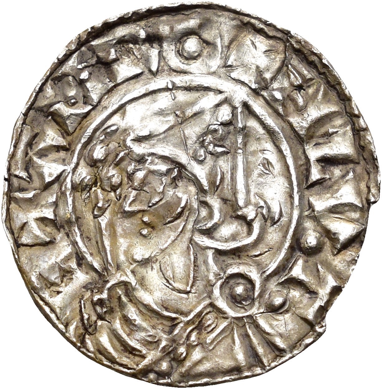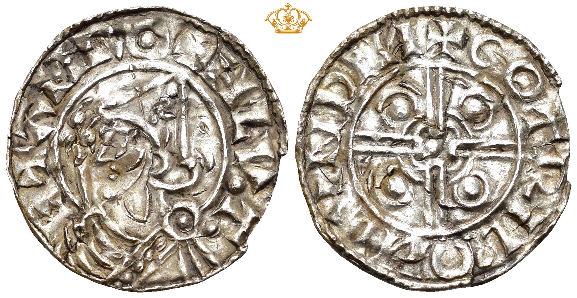 Penning, slået efter 1023. 0.73 g. Imitasjon av Pointed Helmet-type (1023-1029). +HLV.T. E+AHR / +COTRIL OII LVNDIN. Blankettrevner. Denne sjeldne imitasjon inngår i den lille Pointed Helmet-kjede 211.