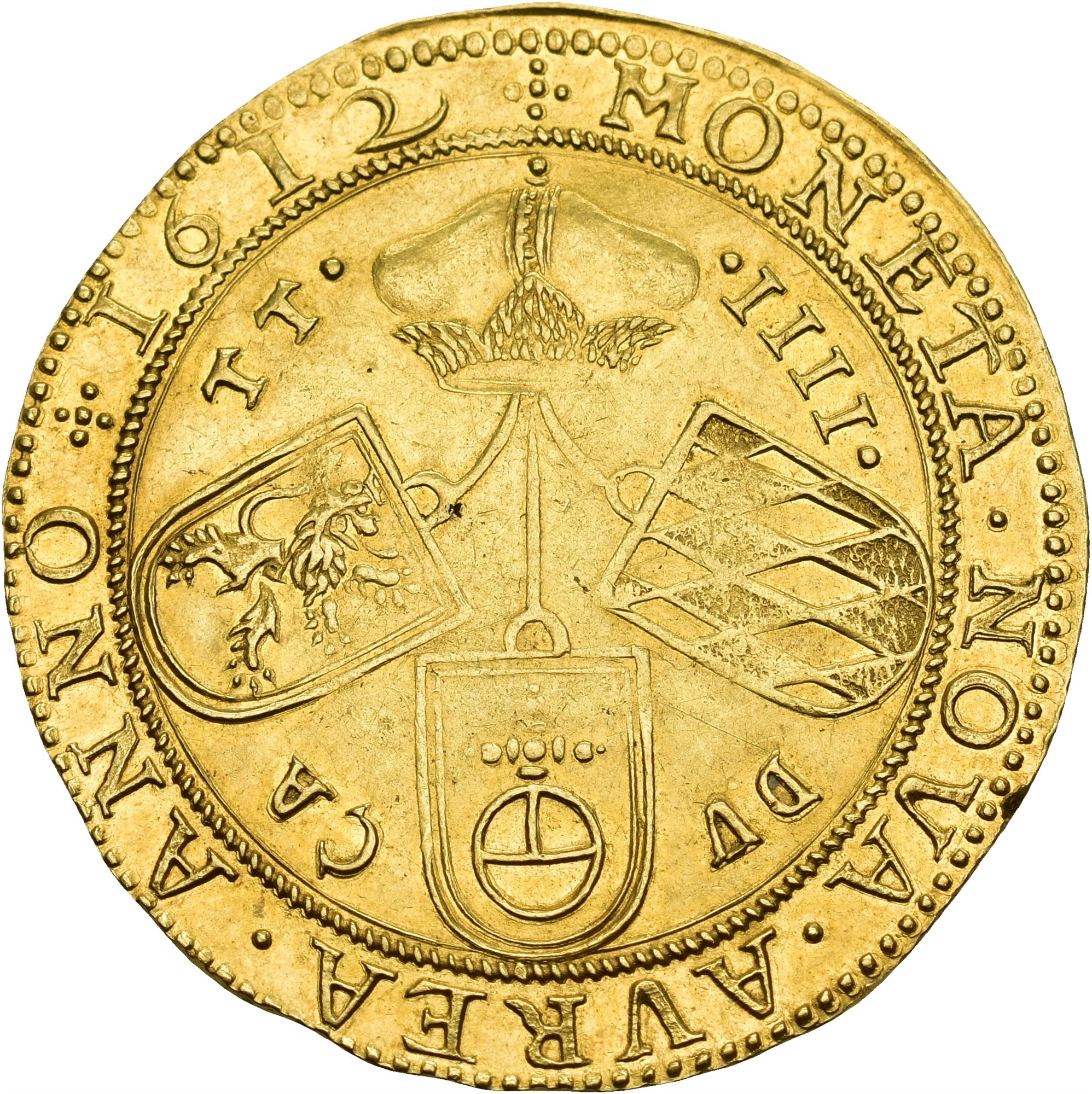 4 Ducats, 1612. 13.91 g. FRIDERICVS D G C P ELECTOR, armored king rides right on an adorned horse, presenting the orb with his right hand. On reverse MONETA NOVA AVREA ANNO 1612 / IIII DVCATT, electoral cap, from which hang the three Palatine coats of arms bearing the lion, the orb, and the lozenges. Very small edge nick. Of the utmost rarity. A very attractive, lustrous specimen.