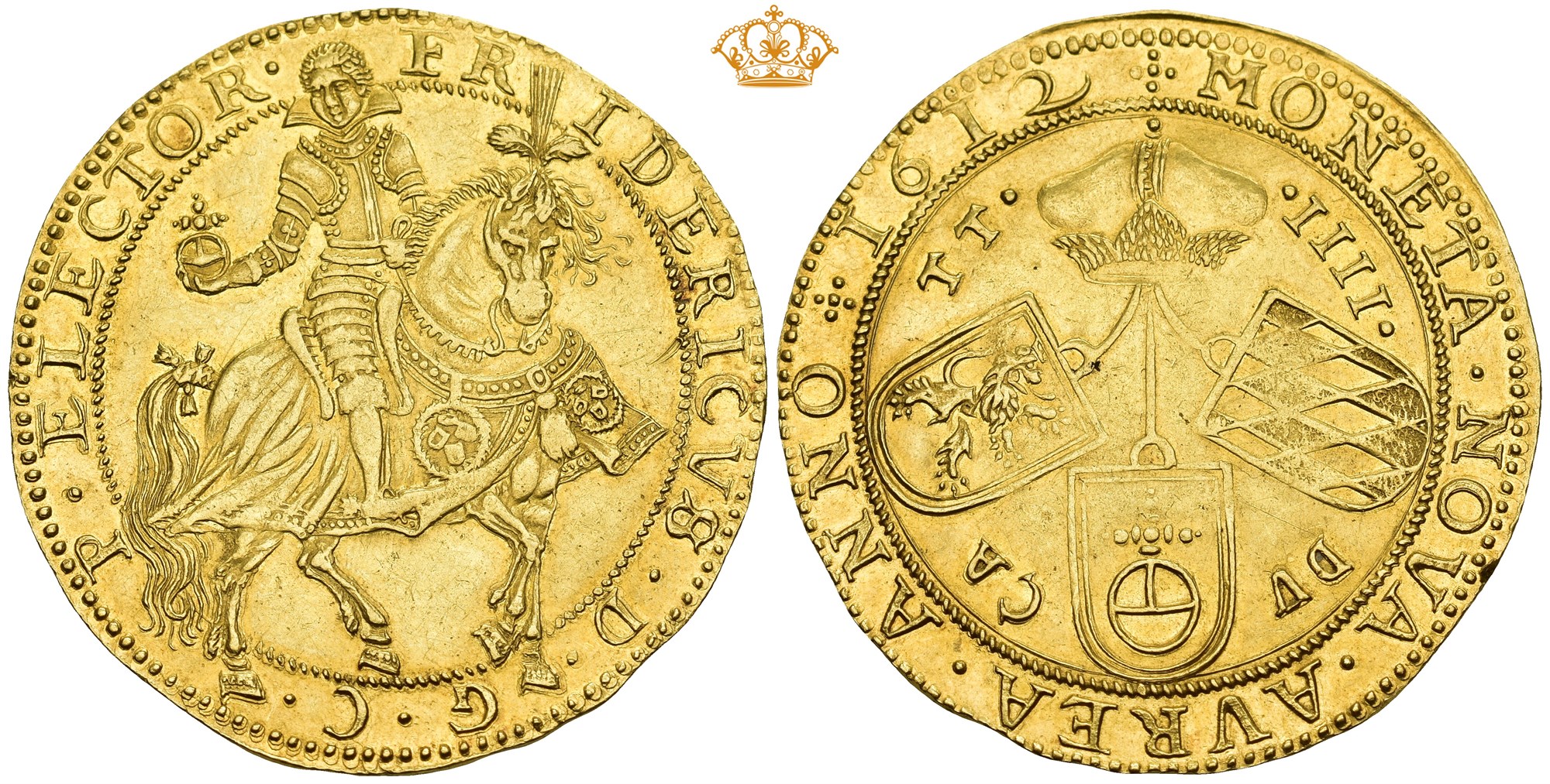 4 Ducats, 1612. 13.91 g. FRIDERICVS D G C P ELECTOR, armored king rides right on an adorned horse, presenting the orb with his right hand. On reverse MONETA NOVA AVREA ANNO 1612 / IIII DVCATT, electoral cap, from which hang the three Palatine coats of arms bearing the lion, the orb, and the lozenges. Very small edge nick. Of the utmost rarity. A very attractive, lustrous specimen.