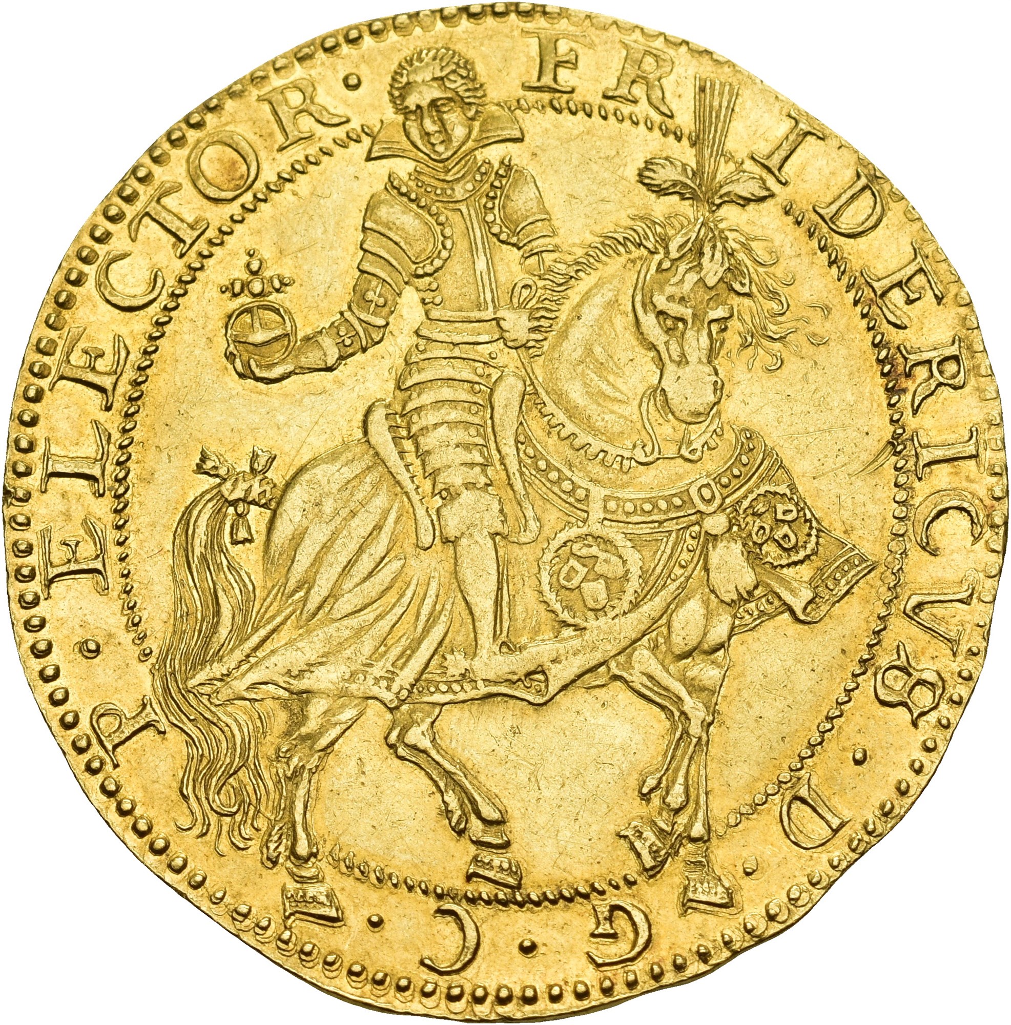 4 Ducats, 1612. 13.91 g. FRIDERICVS D G C P ELECTOR, armored king rides right on an adorned horse, presenting the orb with his right hand. On reverse MONETA NOVA AVREA ANNO 1612 / IIII DVCATT, electoral cap, from which hang the three Palatine coats of arms bearing the lion, the orb, and the lozenges. Very small edge nick. Of the utmost rarity. A very attractive, lustrous specimen.