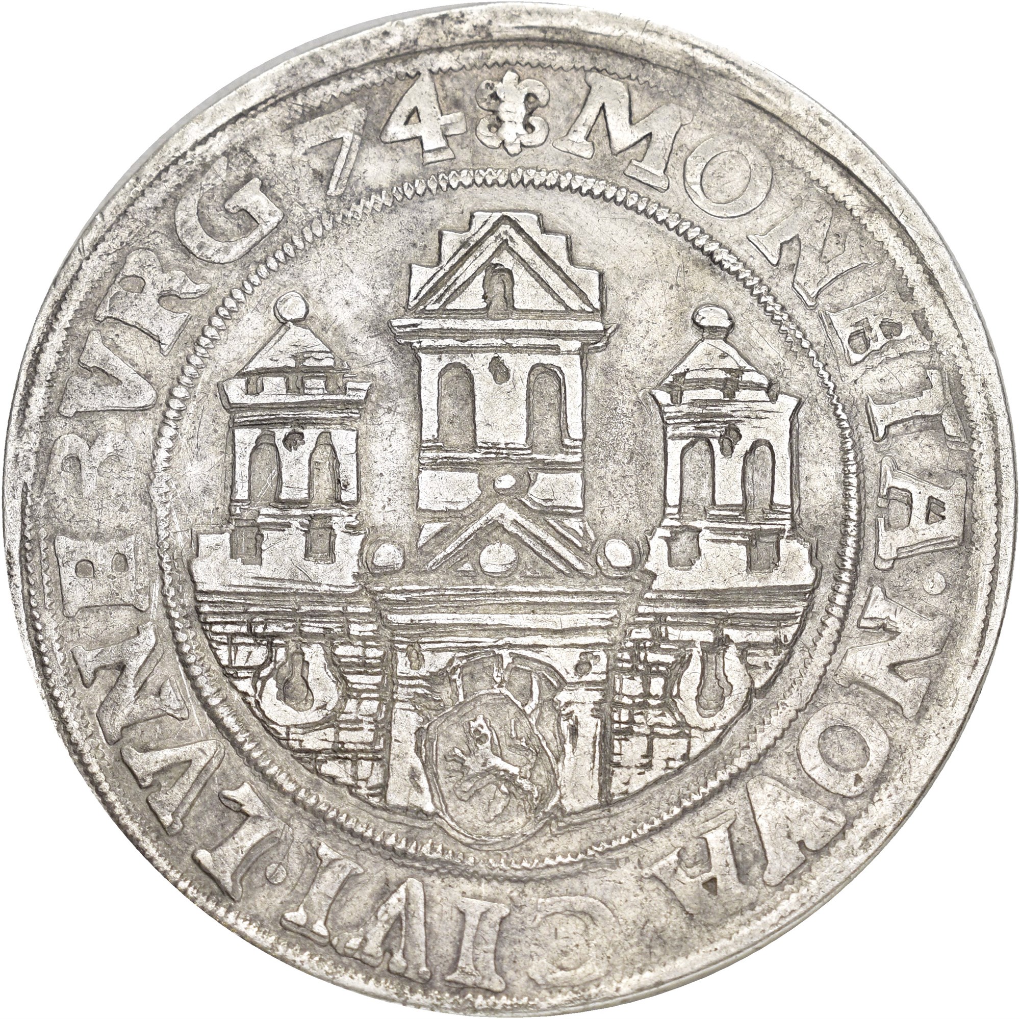 Taler 1574, Lüneburg. 28.74 g. MONETA NOVA CIVI LVNEBVRG 74, on reverse the title of Maximillian II: MAXIMILIA II AVP F DECRETO. Only two specimens known, the other one is in Schweizerisches Nationalmuseum, Zürich.