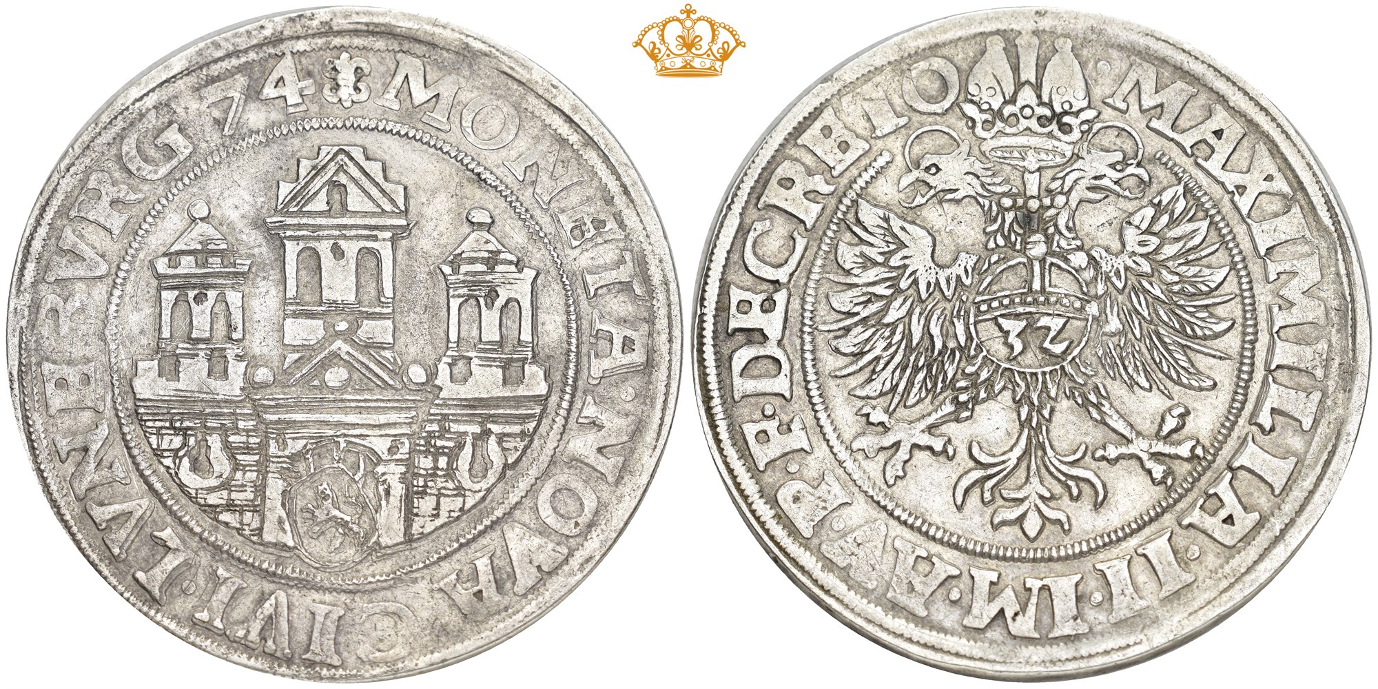 Taler 1574, Lüneburg. 28.74 g. MONETA NOVA CIVI LVNEBVRG 74, on reverse the title of Maximillian II: MAXIMILIA II AVP F DECRETO. Only two specimens known, the other one is in Schweizerisches Nationalmuseum, Zürich.
