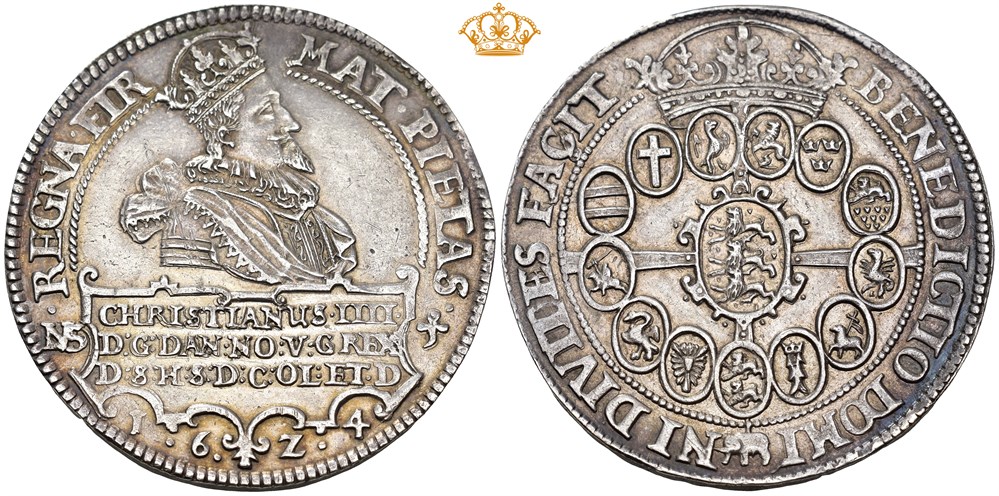 Speciedaler 1624, København. 29,05 g. Attraktivt eksemplar med enkelte små spor av stålblå patina fra randen, svak ripe på advers / Attractive specimen with some small traces of steel-blue patina from the edge, minor scratch on obverse.