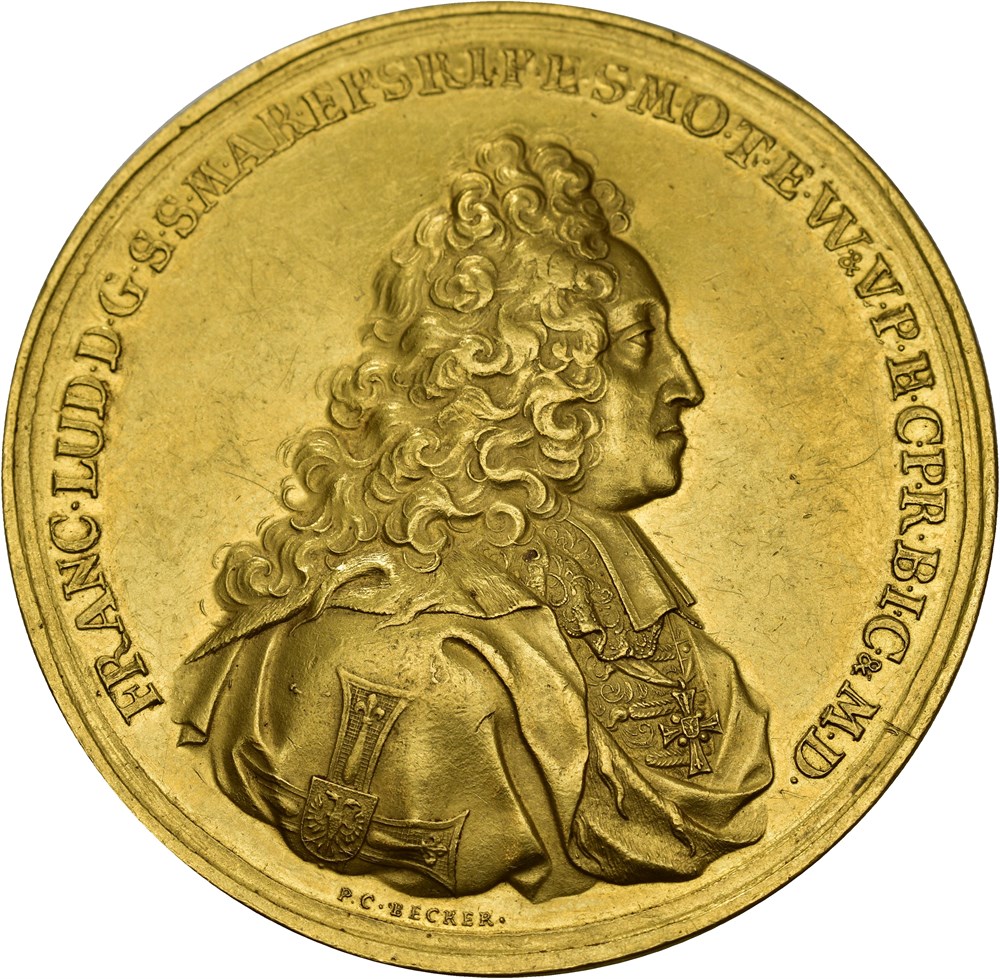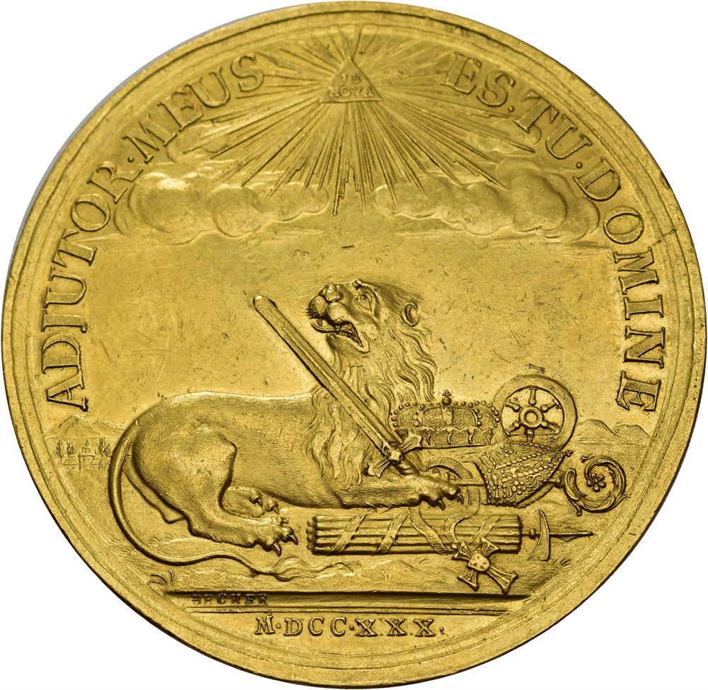 Gold medal / 30 Ducats 1730. 104.58 g. Dies by Philipp Christoph Becker, both dies signed. Perhaps commemorating his 20 years of service in Mainz. Bust facing right, wearing a jeweled cross and a cloak, adorned at the shoulder with the Grand Master's cross of the Teutonic Order. On reverse a landscape bordered by mountains, a lion lies facing right, head turned back, holding between its forepaws a sword, electoral hat, mitre, crozier, fasces, and the Wheel of Mainz; above, a radiant triangle with JE HOVA above clouds. The value 'XXX' primitively engraved on rim. Tine scratches. Lovely condition for this impressive large gold piece, presumably unique.