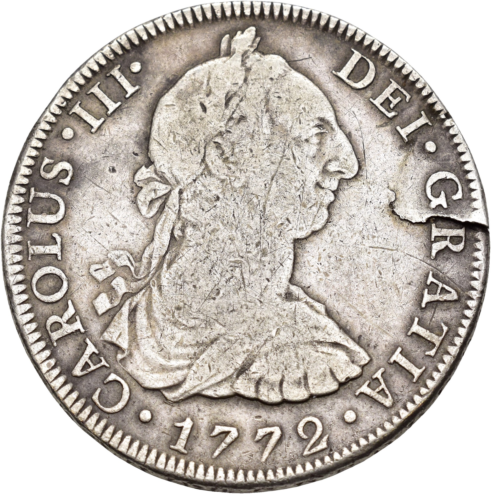 8 Reales 1772 FM, Casa de Moneda, Mexico city. 26.67 g. Variant with inverted assayer’s initials. Planchet flaw at the edge.