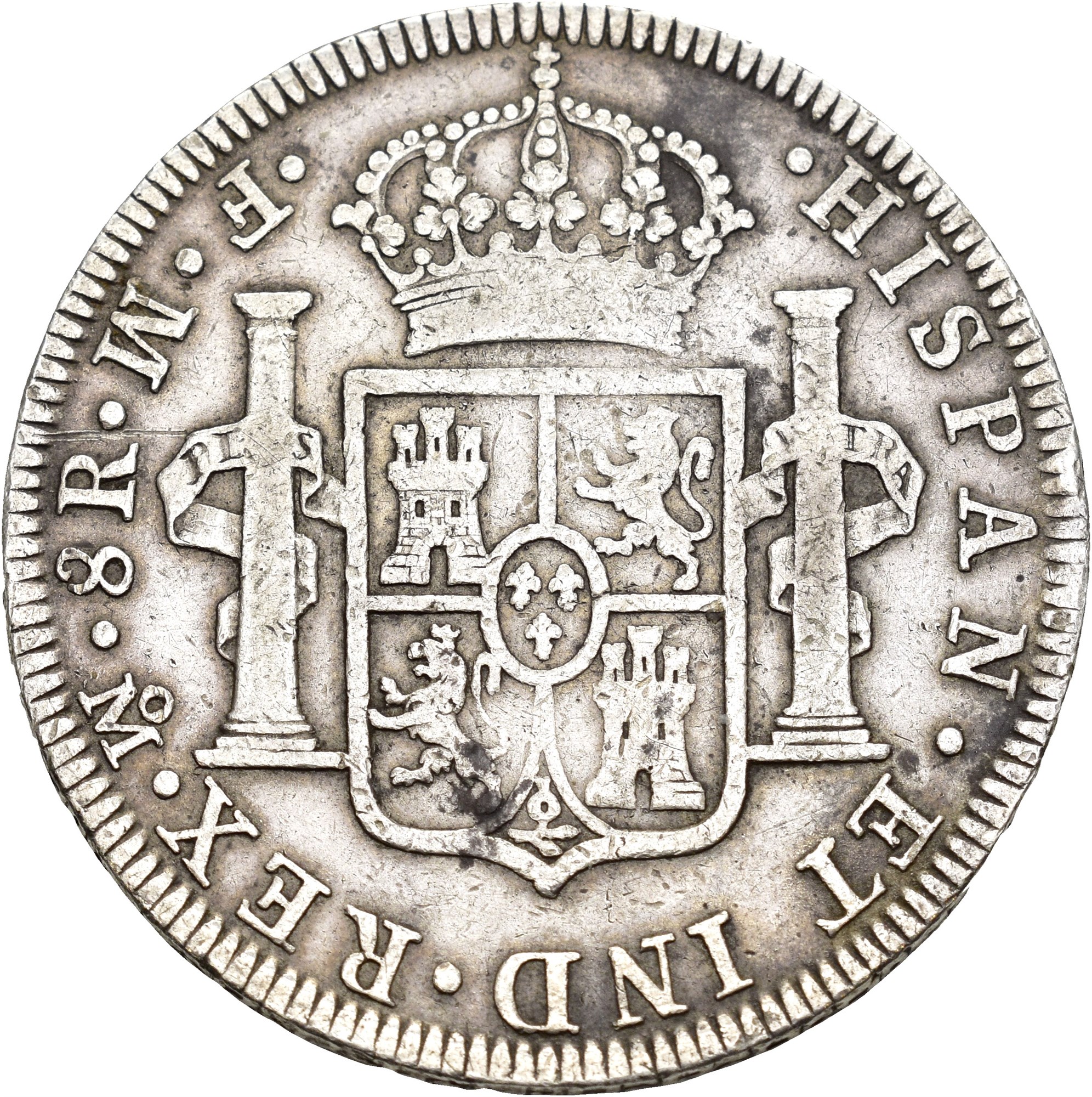 8 Reales 1772 FM, Casa de Moneda, Mexico city. 26.67 g. Variant with inverted assayer’s initials. Planchet flaw at the edge.