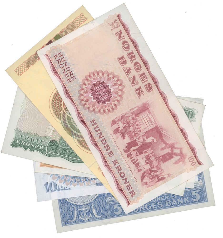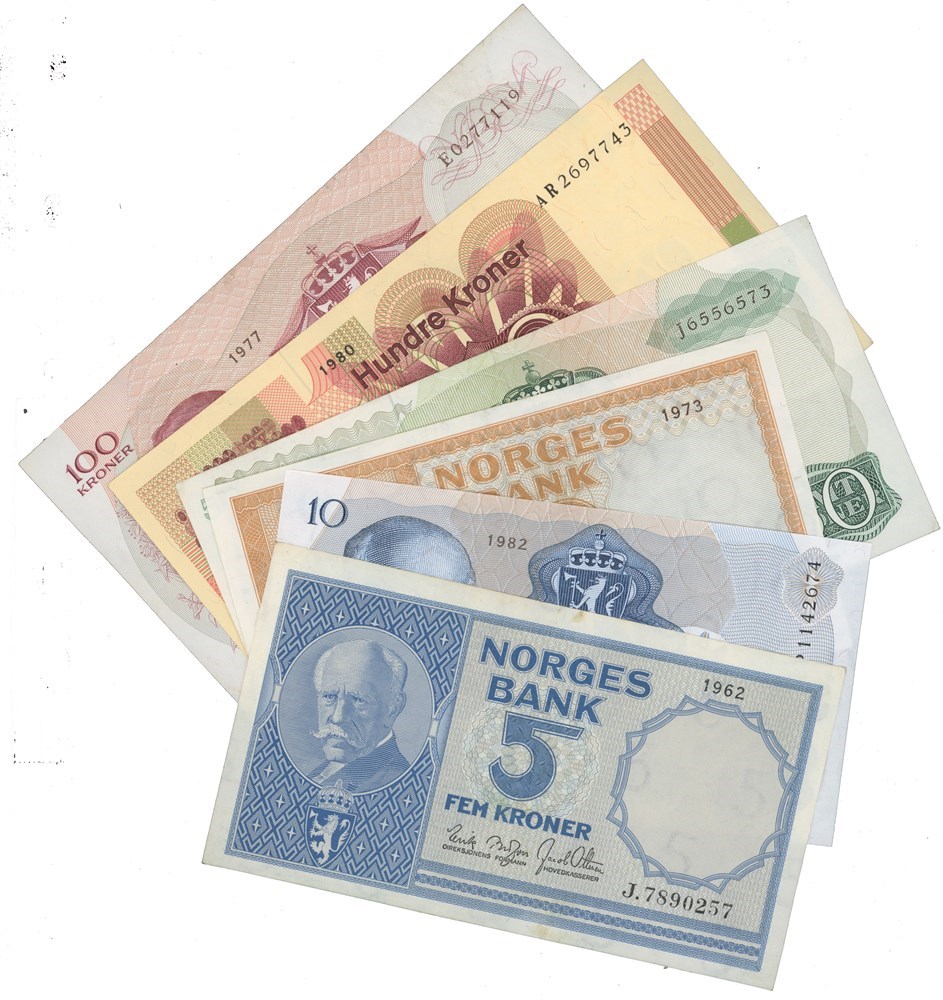 Lott 6 stk. 100 kroner 1977 E og 1980 AR, 50 kroner 1979 J, 10 kroner 1973 M og 1982 CP, 5 kroner 1962 J.
