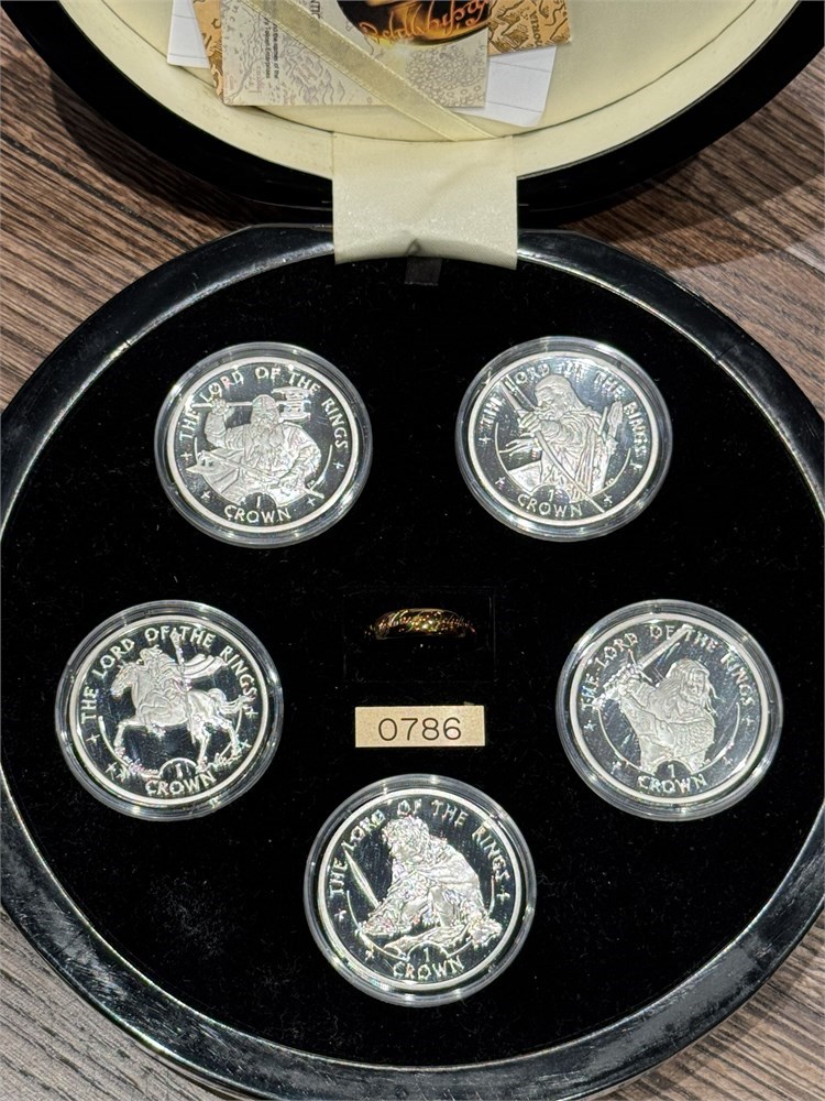 Ringenes Herre myntsett med 5 stk. 1 crown 2003 og "The One Ring". Pobjoy Mint