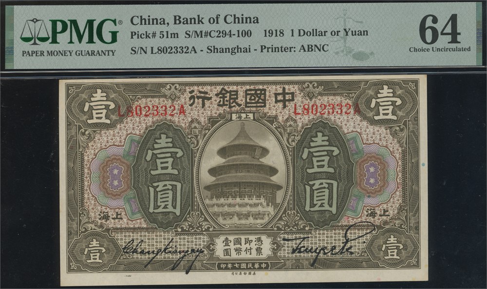 1 Dollar or Yuan 1918 S/N L802332A