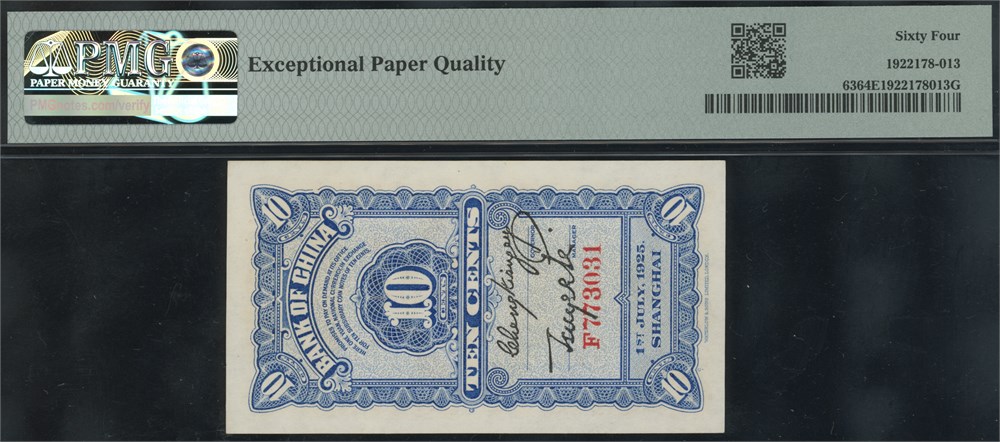 10 Cents 1925 S/N F773031, Shanghai.