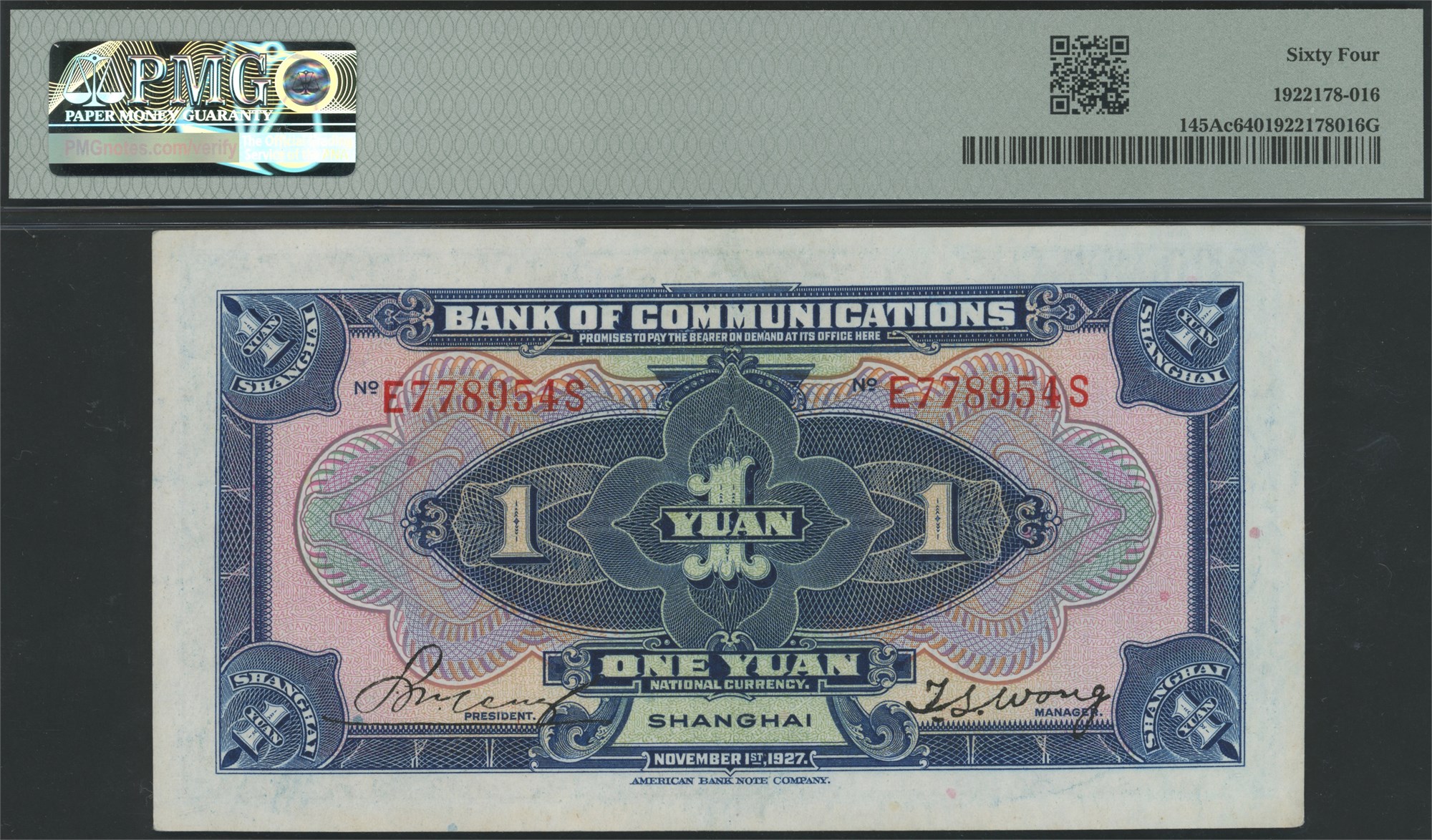1 Yuan 1927 S/N E778954S, Shanghai.