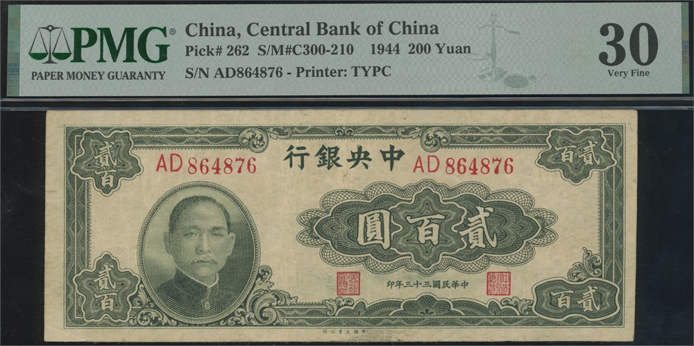 Lot 2 pcs. 200 Yuan S/N AD864876 & 400 Yuan 1944 S/N AM761873.
