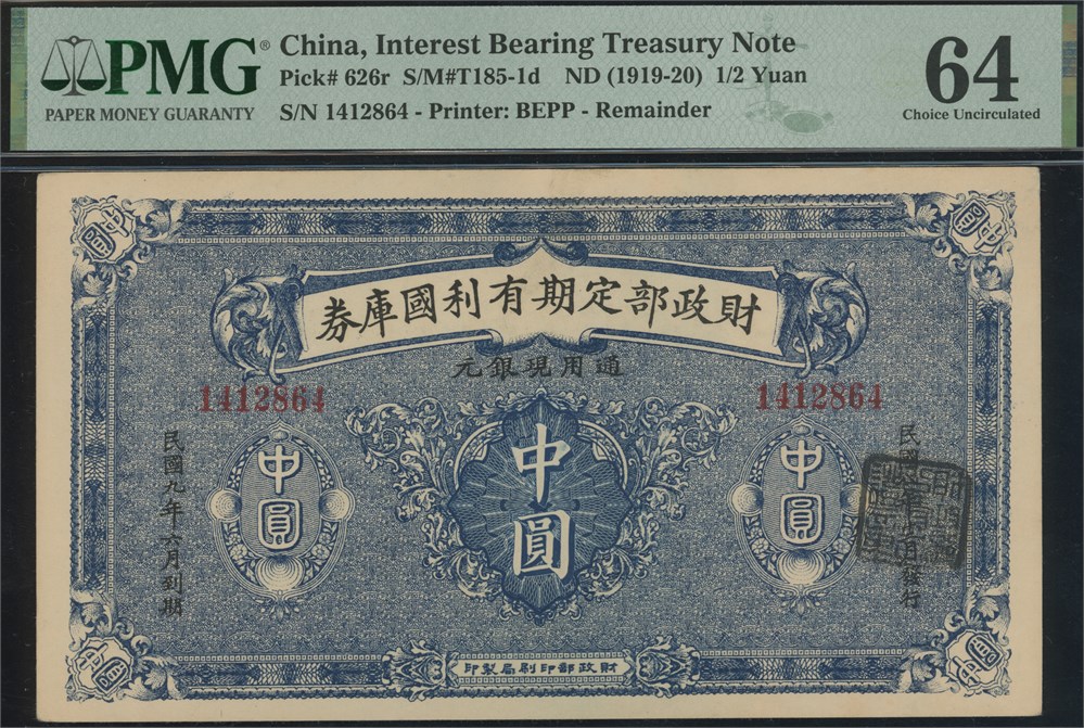 1/2 Yuan ND (1919-20) S/N 1412864, remainder.