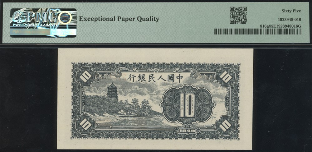 10 Yuan 1949 S/N 33613449 Block 123. A handsome note in gem grade.