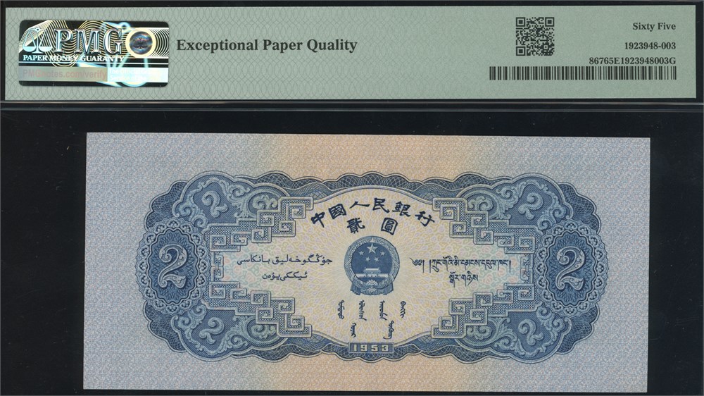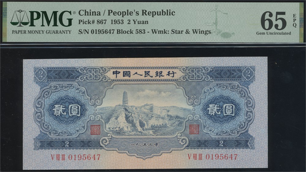 2 Yuan 1953 S/N 0195647 Block 583. Nice note in stunning blue colors.
