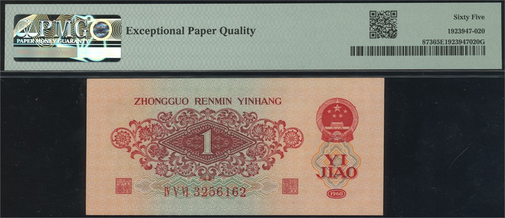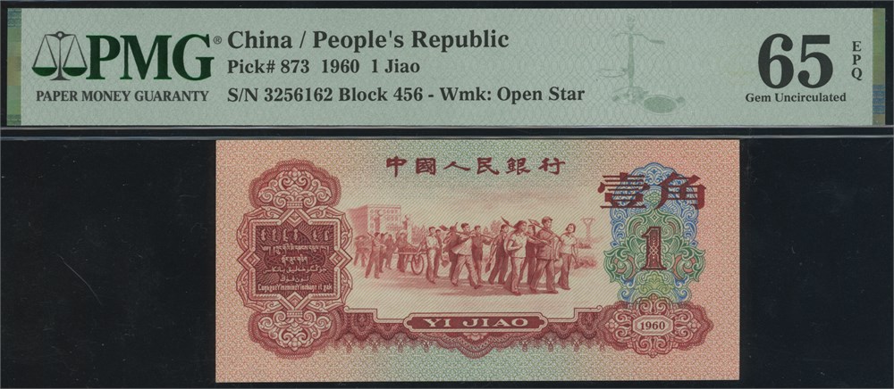 1 Jiao 1960 S/N 3256162 Block 456. The scarce "walking to the right" 1 Jiao in gem grade.