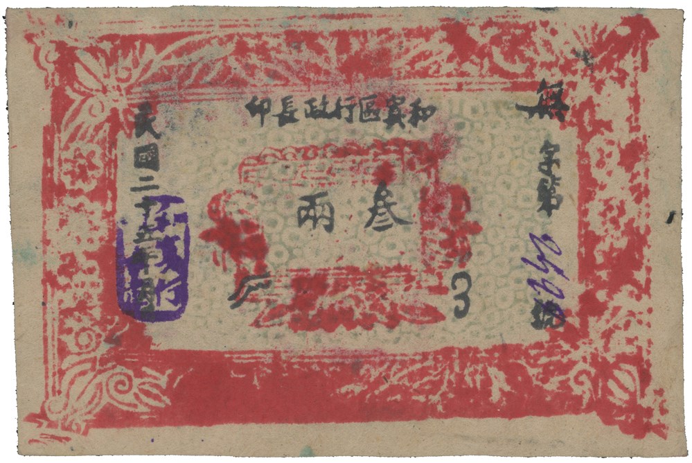 Lot 3 pcs. 1 Tael, 3 Taels and 100 Wen Red Cash 1933/36.