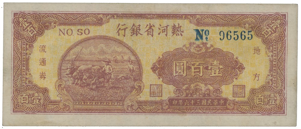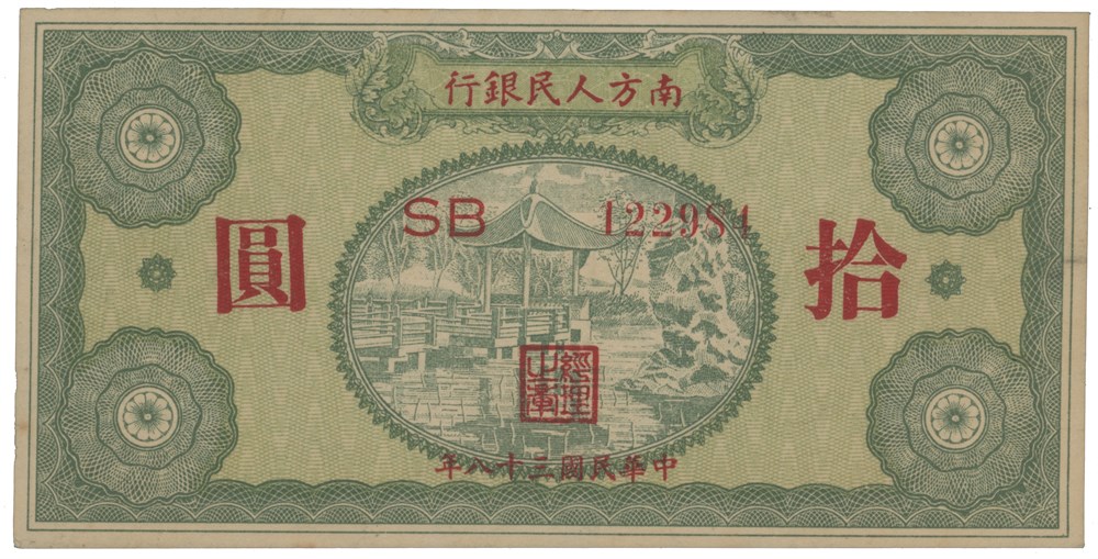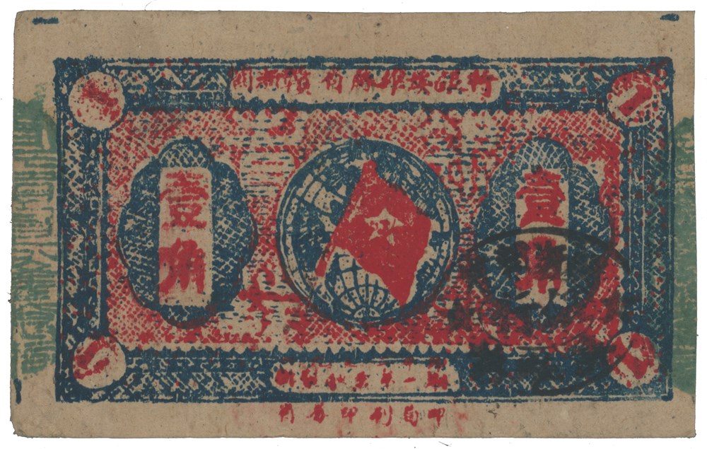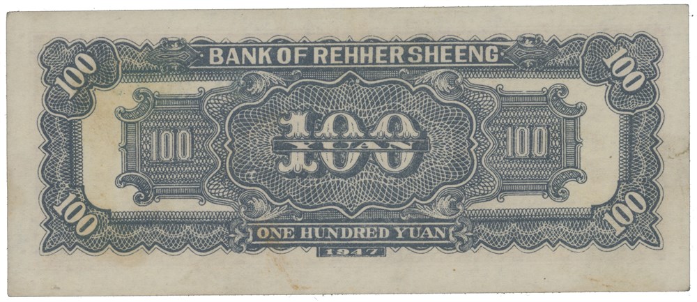 Lot 4 pcs. Bank of Rehher Sheeng 100 Yuan 1947 S/N 96565, two scarce notes from Fukien-Chekiang-Kiangsi Soviet Bank 1 Chiao and 1 Yuan 1932-33, and Southern Peoples Bank 10 Yuan 1949 S/N SB122984.