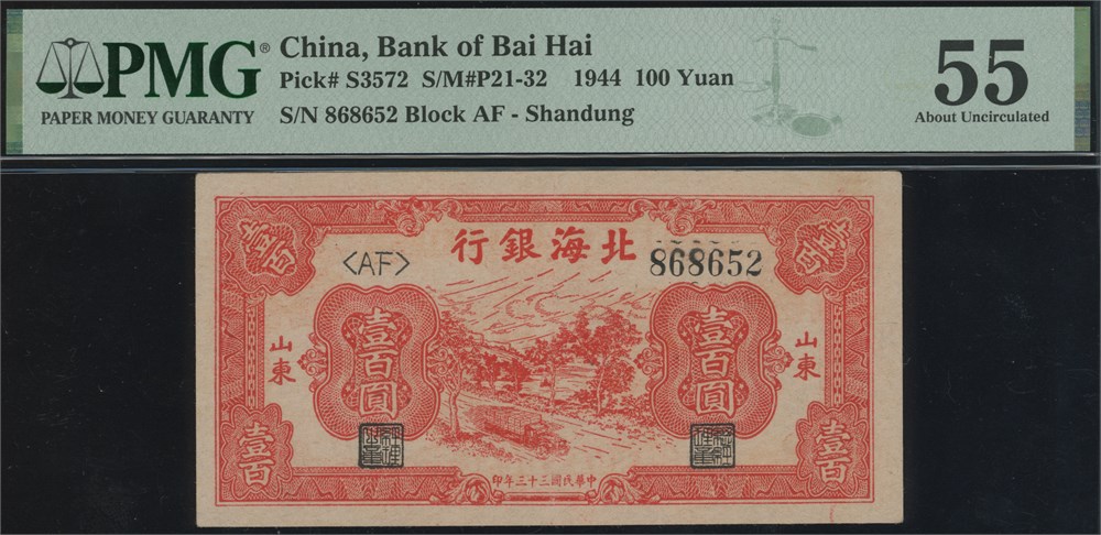 100 Yuan 1944 S/N 868652 Block AF, Shandung.