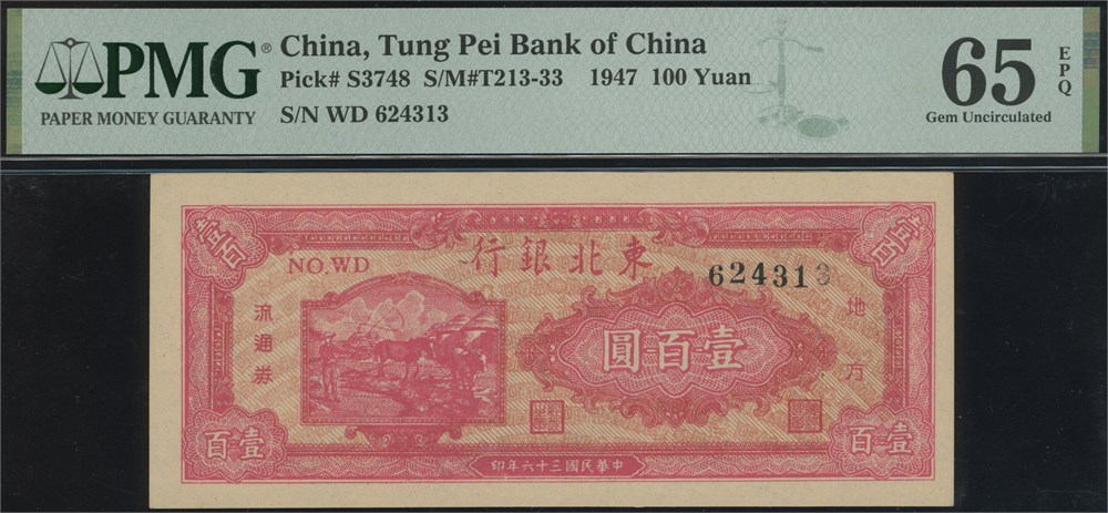 100 Yuan 1947 S/N WD 624313. A fresh example with an EPQ status in second highest grade in the PMG population.