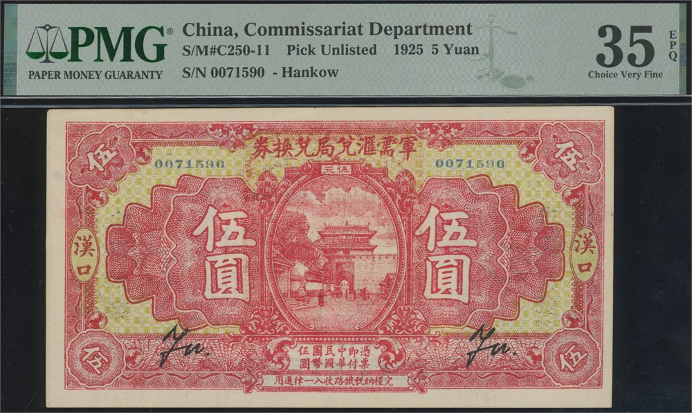 5 Yuan 1925 S/N 0071590, Hankow. Attractive and scarce 5 Yuan note awarded the EPQ status, issued by Wu Pei Fu after his defeat in the Second Zhili-Fengtien War in 1924.