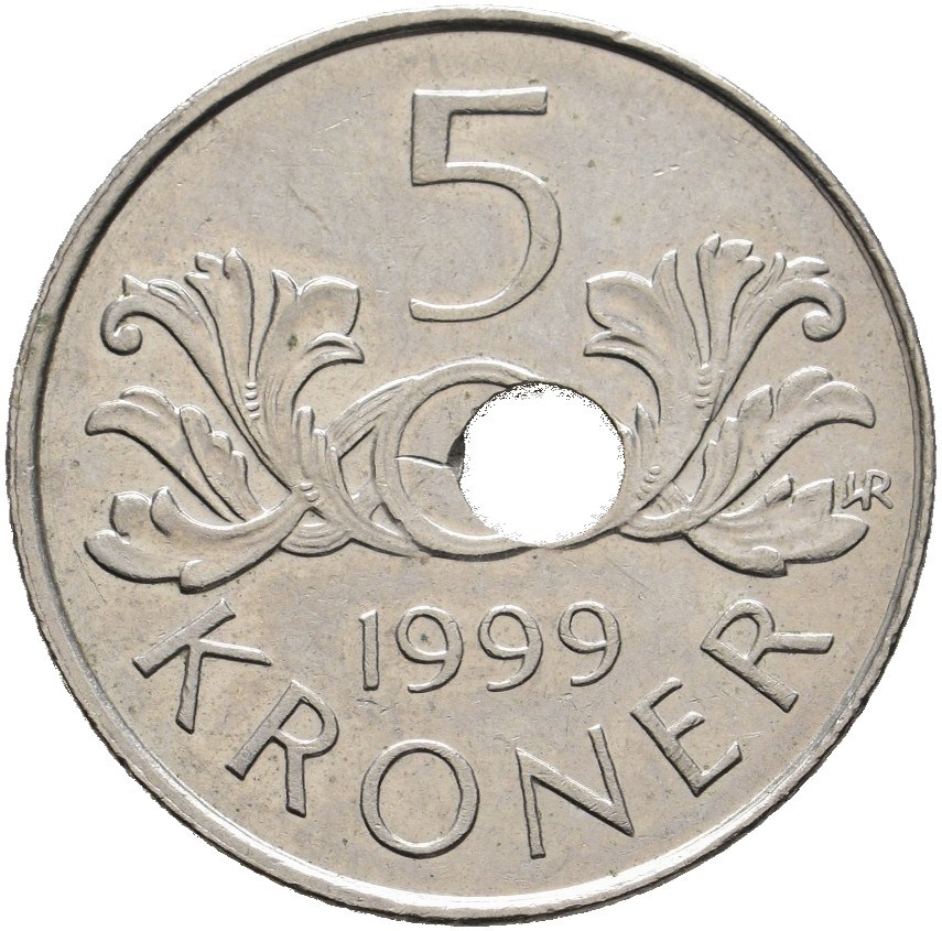 5 krone 1999 skjevt hull