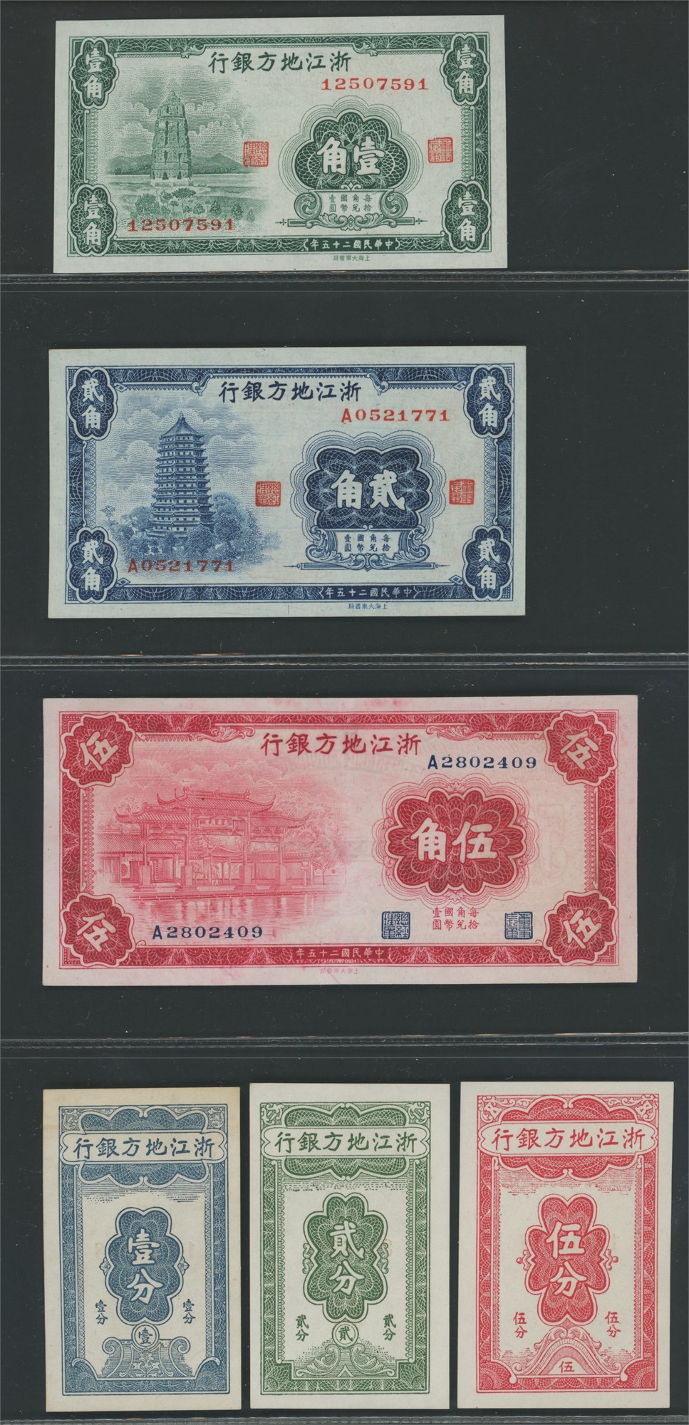 Lot 11 pcs. 1 Fen & 2 Chiao ND (ca. 1937) (Anhwei Regional Bank), 1 Yuan 1933, 10 Cents & 20 Cents 1935 (Charhar Commercial Bank), 10, 20 & 50 Cents 1936 and 1, 2 & 5 Fen ND (1938) (Chekiang Provincial Bank).