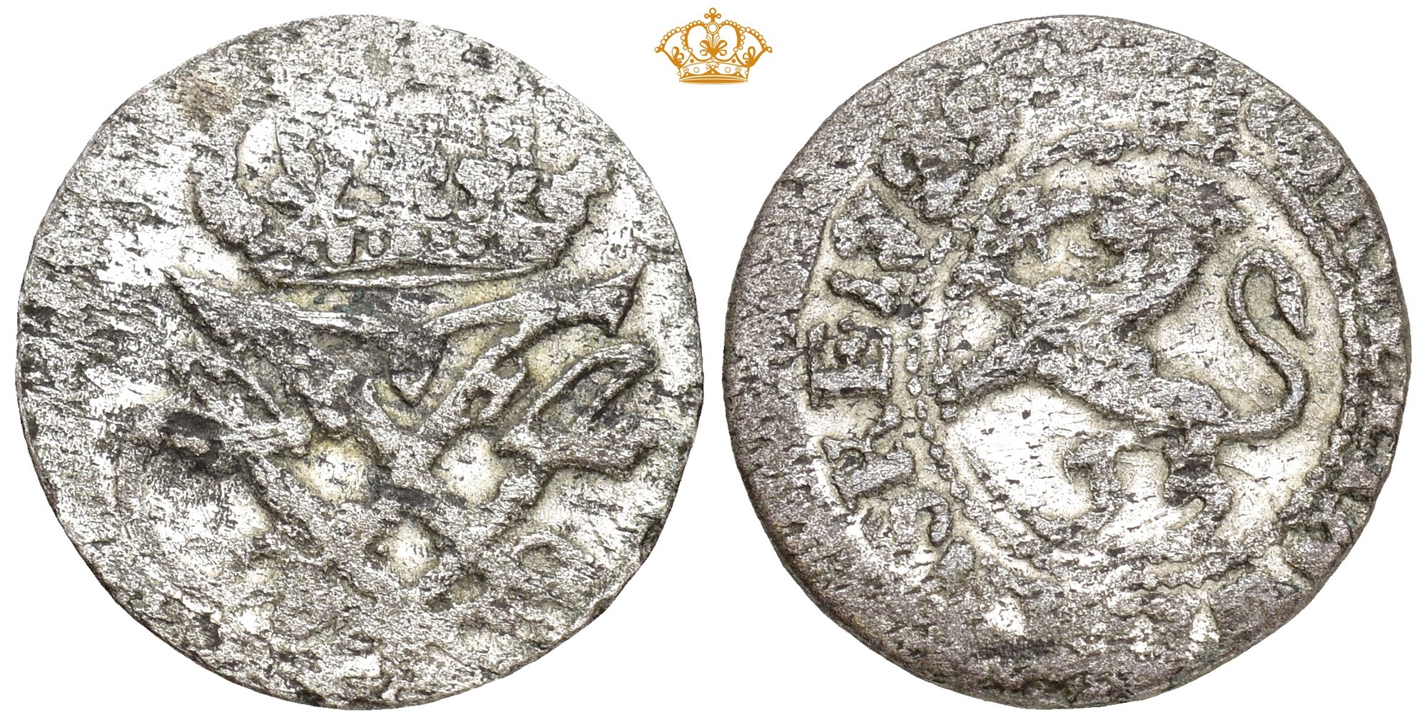 2 skilling 1725. S.6. 1,17 g. Skjevt sentrert pregning. / Off-centred striking.