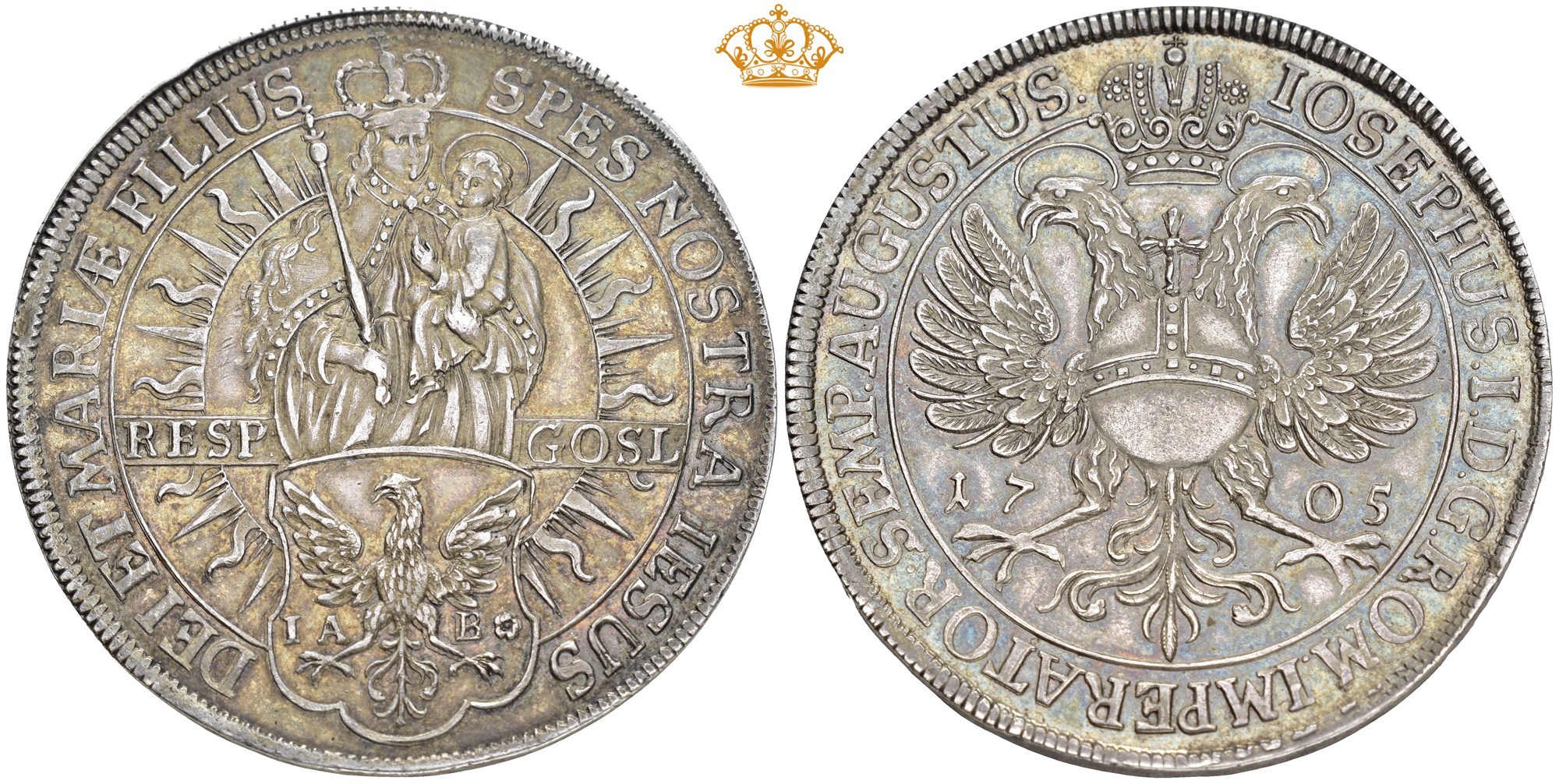 Reichstaler 1705, Goslar. 29,09 g. With title Josef I.Madonna and Child dividing the legend RESP – GOSL; arms below. Lettering SPES NOSTRA IESUS – DEI ET MARIAE FILIUS - Jesus, our hope - son of God and mary.A Reichstaler seldom seen on the market, particularly in this state of preservation