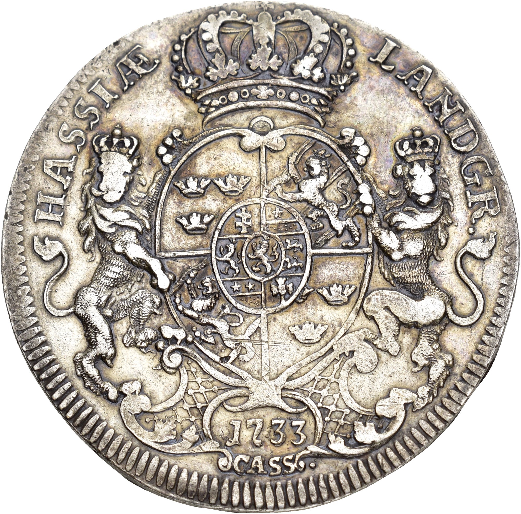 Taler 1733, Kassel. 29,15 g. Mintmaster Louis Rollin (1723-1744) Landgrave Frederick I, 1730–1751, King of Sweden since 1720. Armoured bust right, draped mantle, below L.R. / Crowned lions support crowned Swedish shield with Hessian inescutcheon; below, date above CASS (Cassel/Kassel).<BR>Not uncommon for this type, somewhat weakly struck and on imperfect planchets. Rare