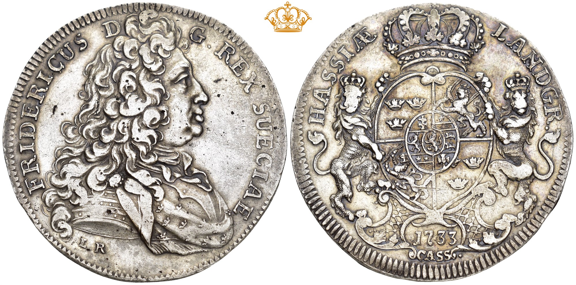 Taler 1733, Kassel. 29,15 g. Mintmaster Louis Rollin (1723-1744) Landgrave Frederick I, 1730–1751, King of Sweden since 1720. Armoured bust right, draped mantle, below L.R. / Crowned lions support crowned Swedish shield with Hessian inescutcheon; below, date above CASS (Cassel/Kassel).<BR>Not uncommon for this type, somewhat weakly struck and on imperfect planchets. Rare