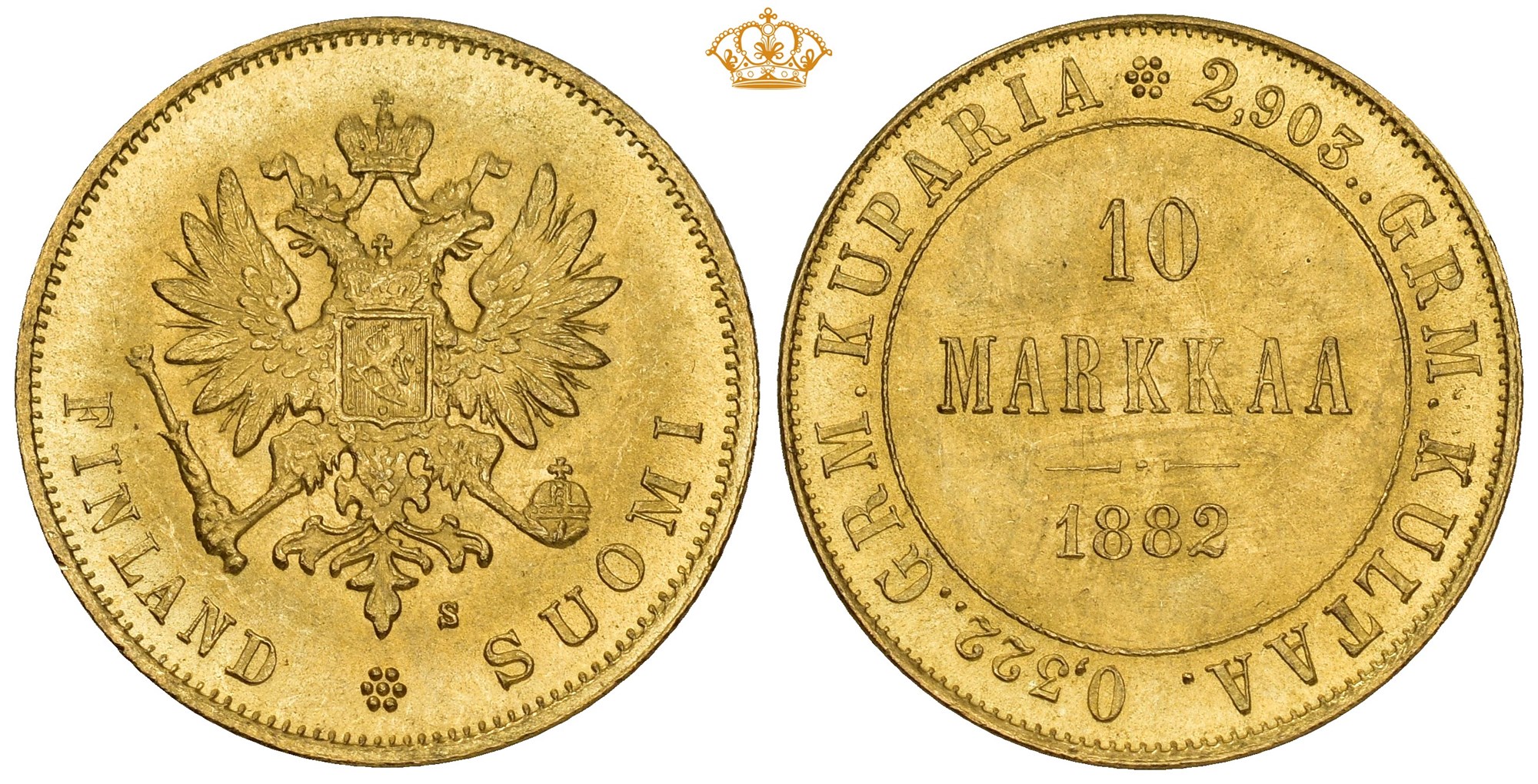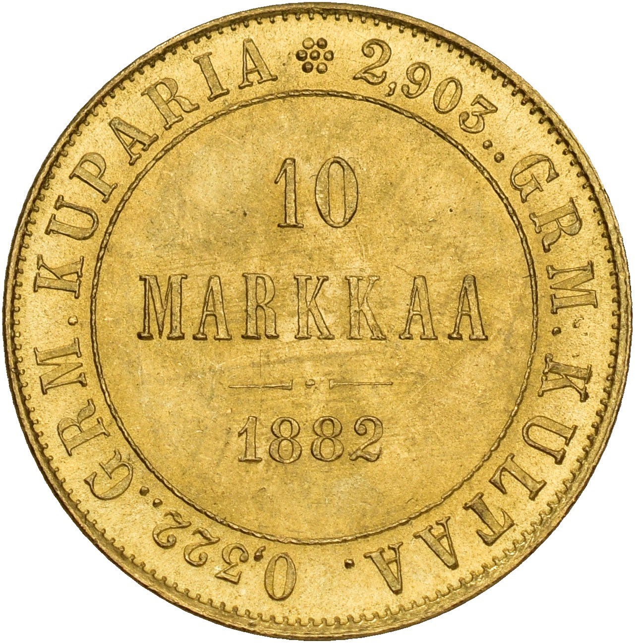 10 Markkaa 1882 S, Helsinki. 3.23 g.