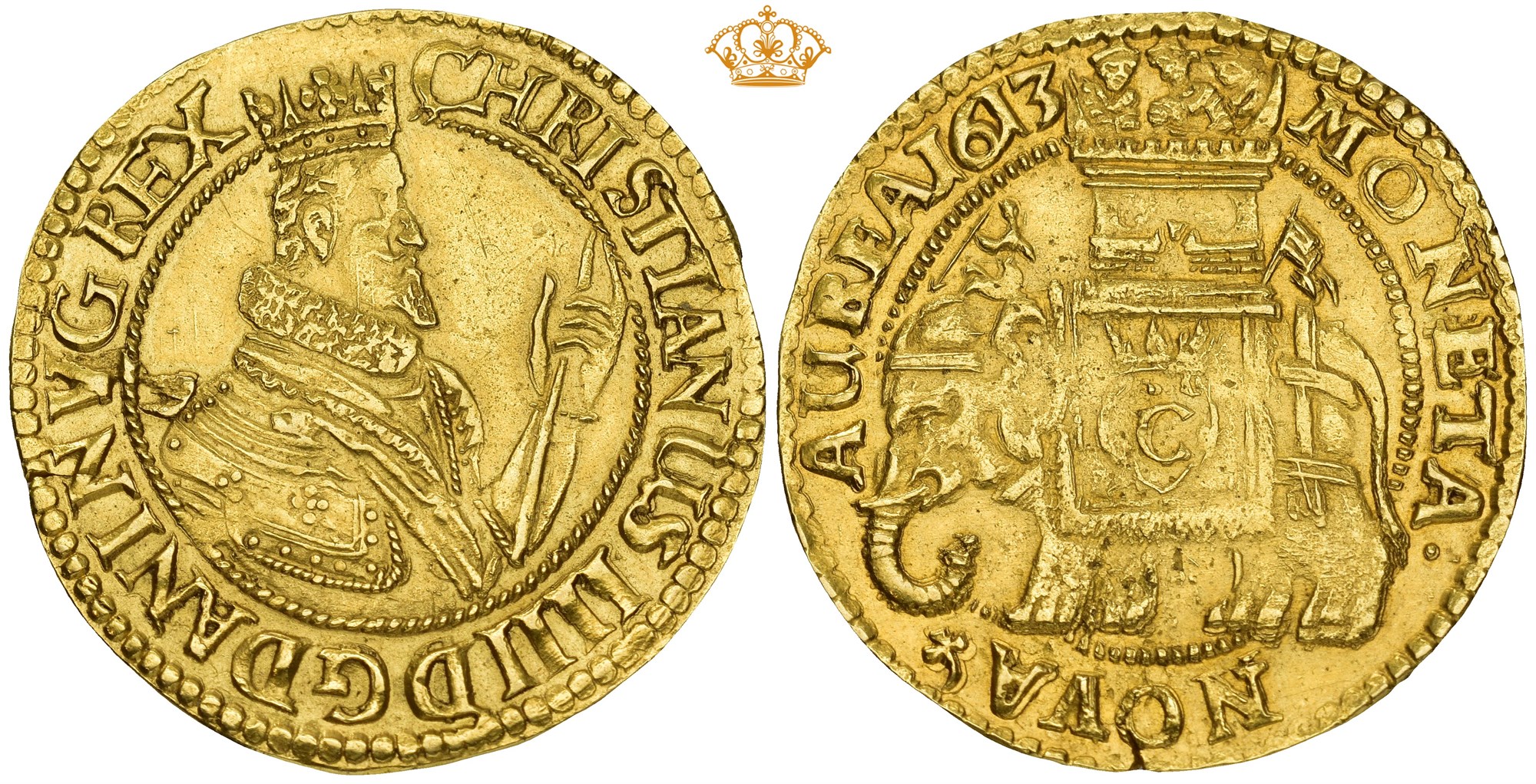 Rosenobel 1613, København. 8.63 g. Liten blanketrevne, let pusset i felter på advers. Uhyre sjelden. Av de 312 eksemplarer som ble preget er det kun få som har overlevd til i dag har ganske få eksemplarer overlevet til i dag.