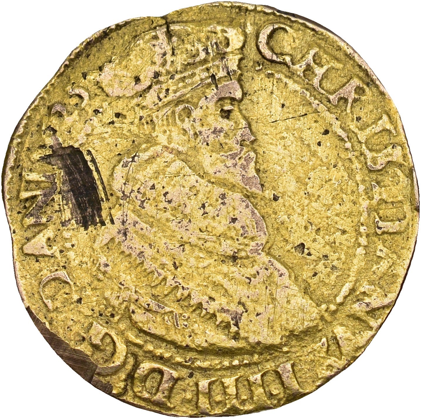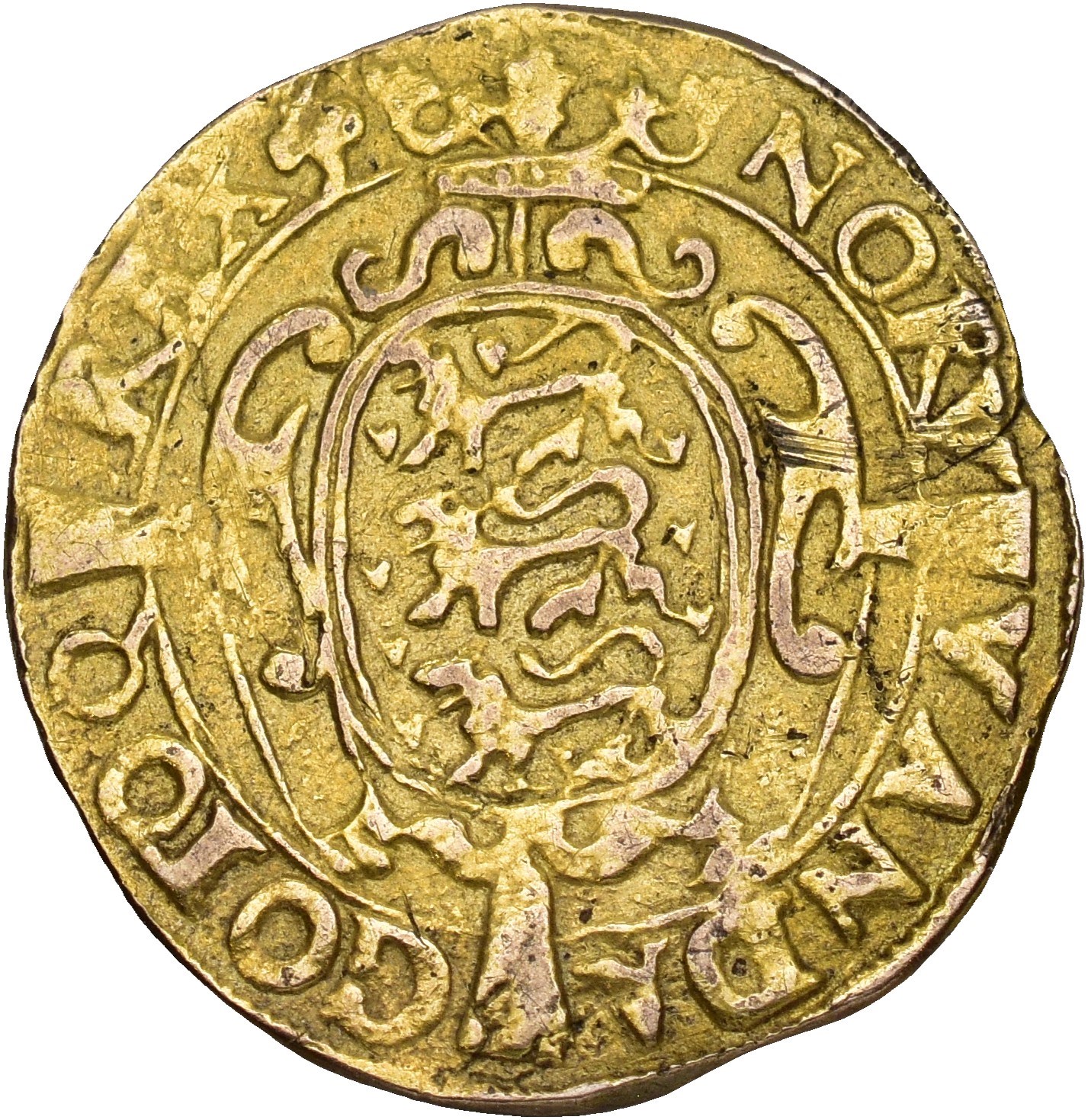 Det må være en samtidig forfalskning. Den er gullbelagt. Det er ikke justermerker, men eldre testmerker, som går gjennom gullbelagget. Motivets grovere stil, se f.eks. kronen og 'løvene' på reversen, avviker også markant fra ekte eksemplarer.