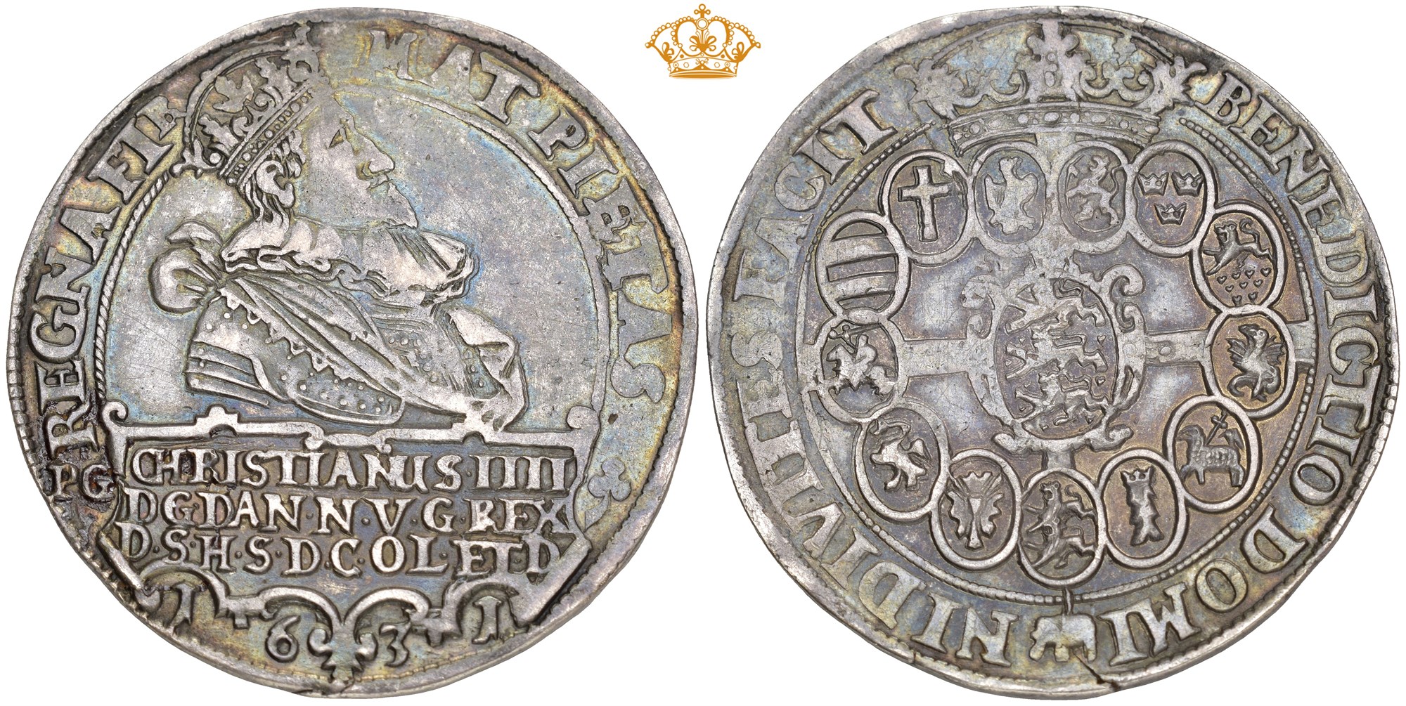 Speciedaler 1631 PG, København. 28.76 g. Sjeldent årstall, fin proveniens og fin toning.