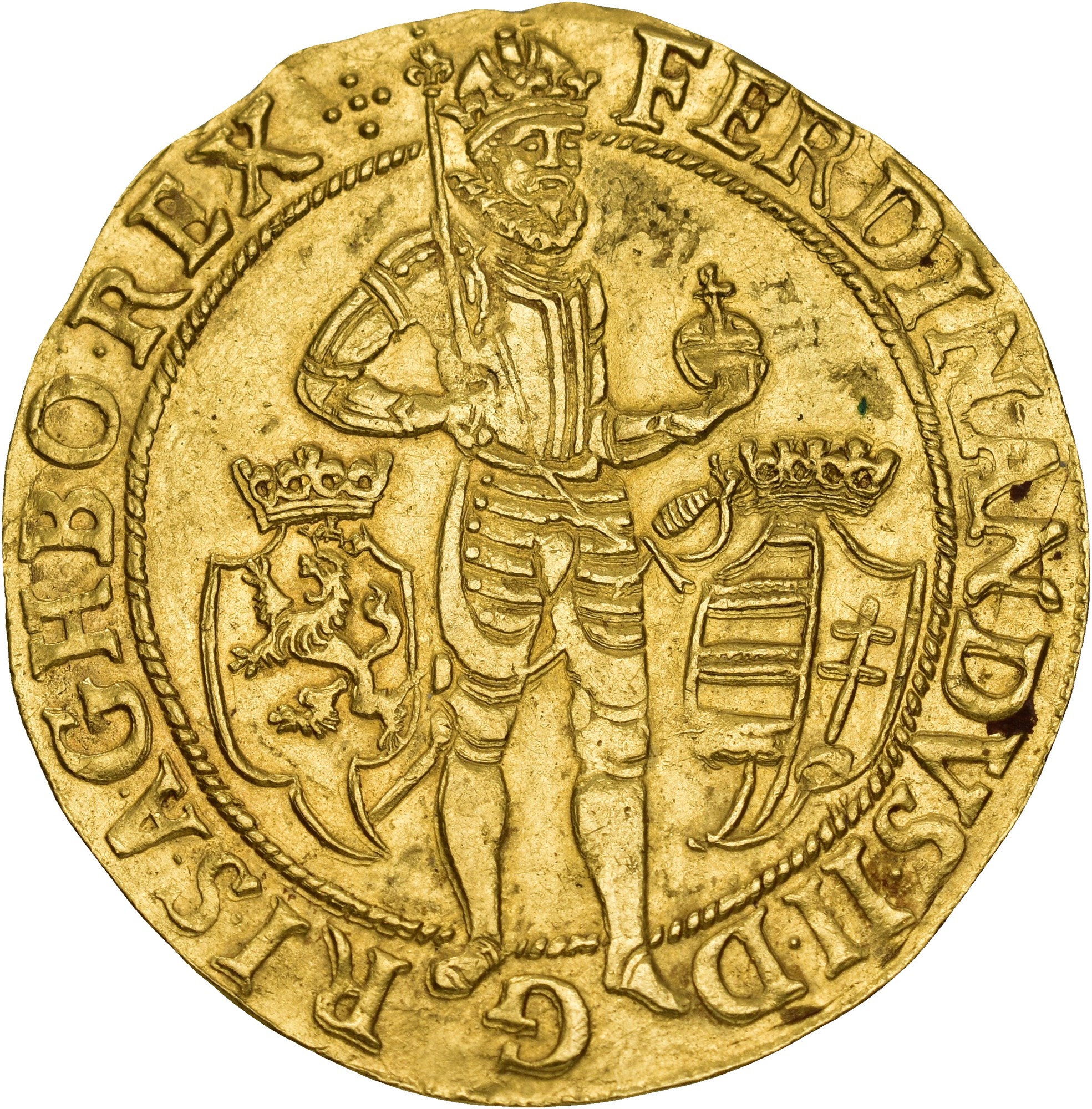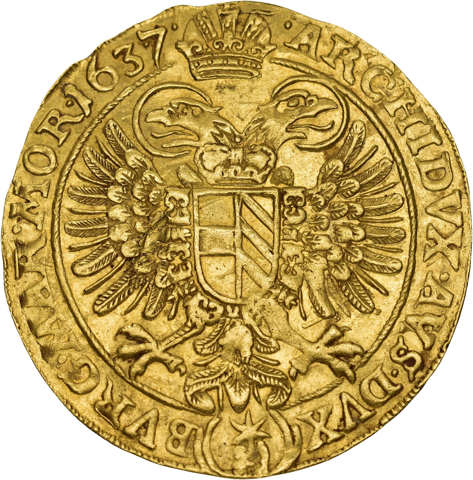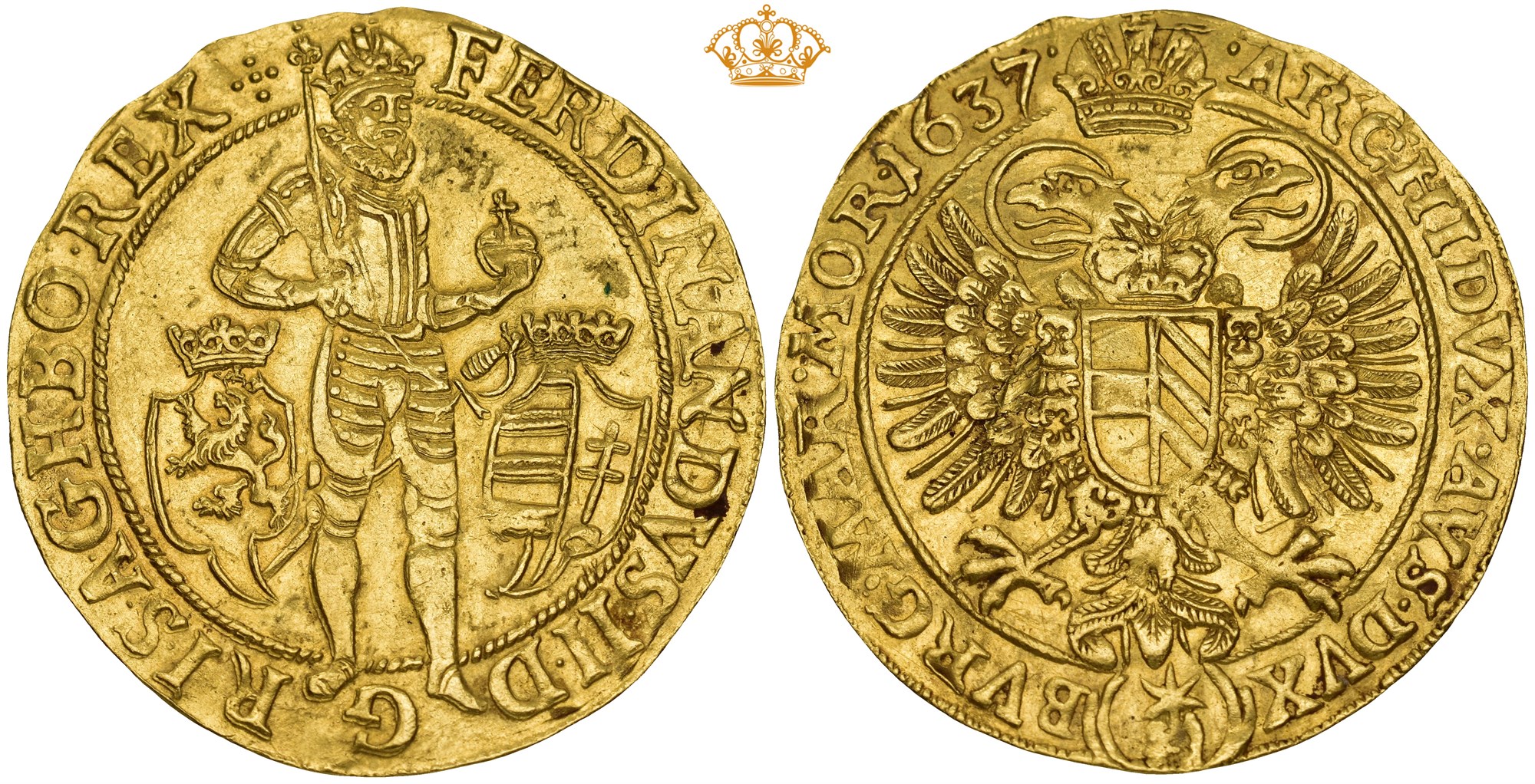 5 Ducats 1637, Prague. 17.36 g. Mintmaster Jakob W. Wolker, mintmark : hand with star. Crowned standing emperor in armor, holding scepter and orb. In the fields, the crowned coats of arms of Bohemia and Hungary. / ARCHID. AVSTR. DVX BVR. MAR. MORA. 1637. Crowned double eagle bearing the quartered arms of Austria and Burgundy; the shield encircled by the collar of the Order of the Golden Fleece. Minor edge nick.