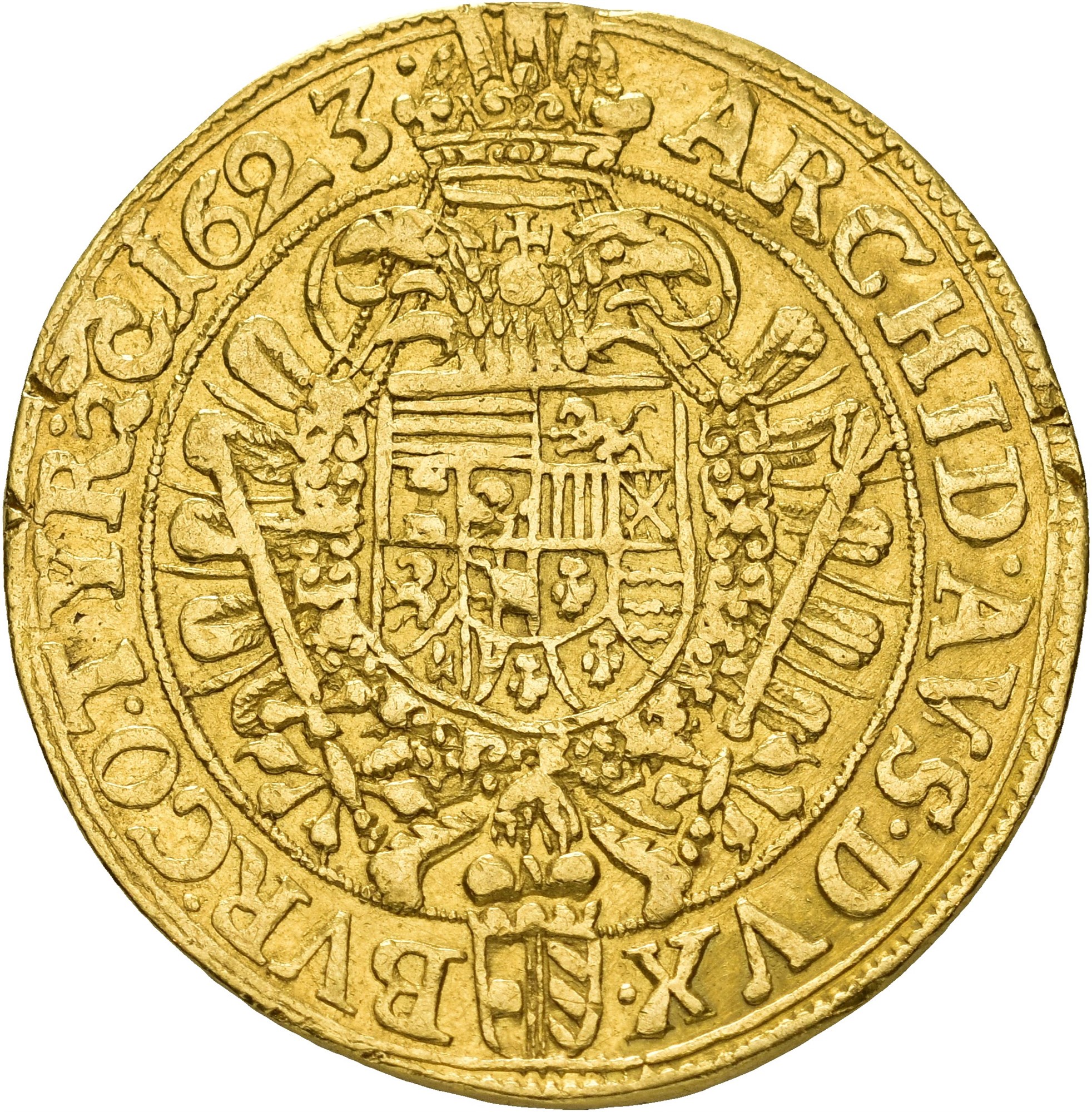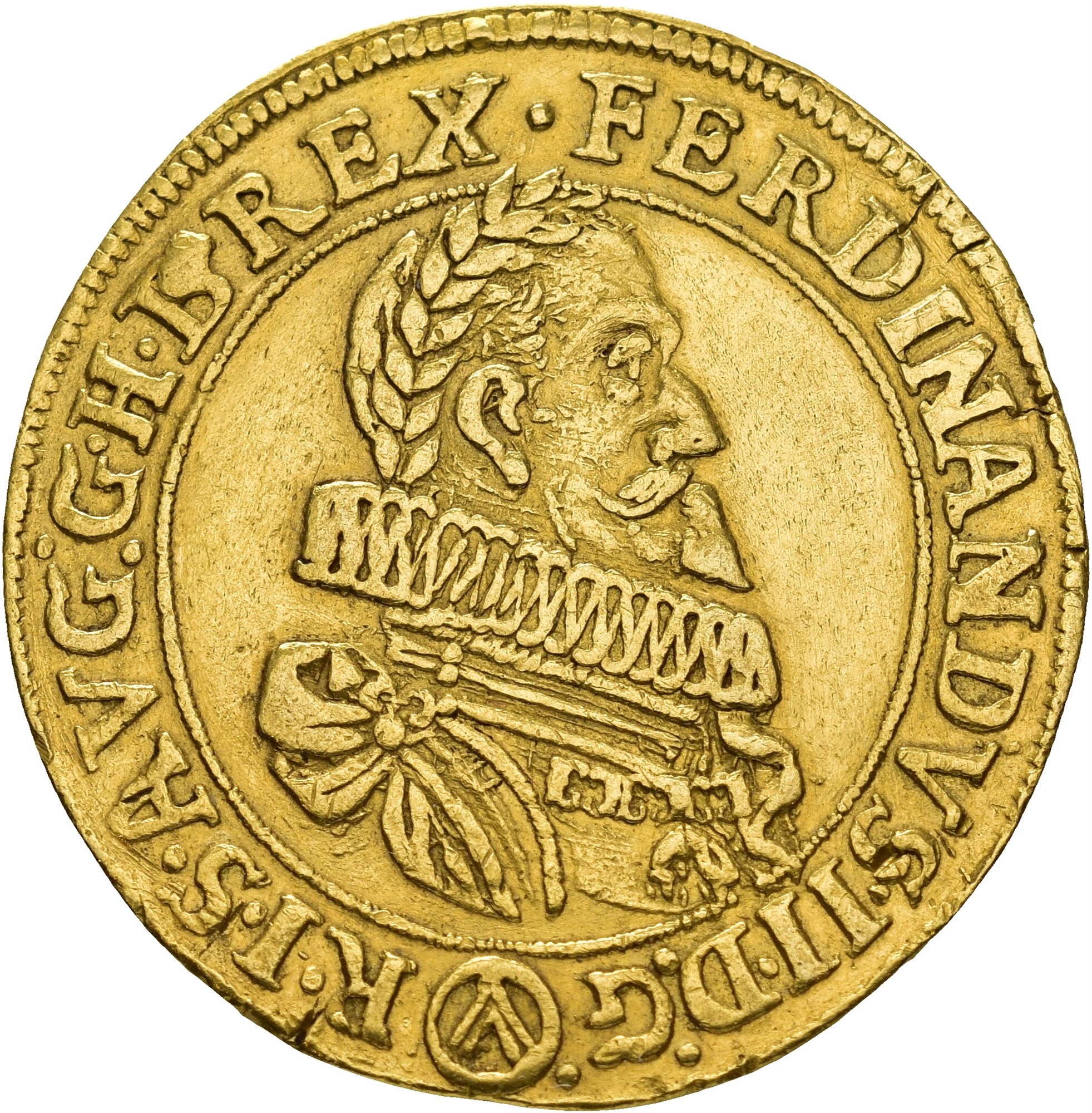 5 Ducats 1623, Prague. 17.36 g. Mintmaster Matthias Fellner. Armoured bust right with laurel wreath, large ruff, mantle and chain of the Golden Fleece. / Crowned double-headed eagle with sword and sceptre; orb between heads; multi-quartered shield on breast, surrounded by the chain of the Golden Fleece. Obverse lightly rubbed, of great rarity.