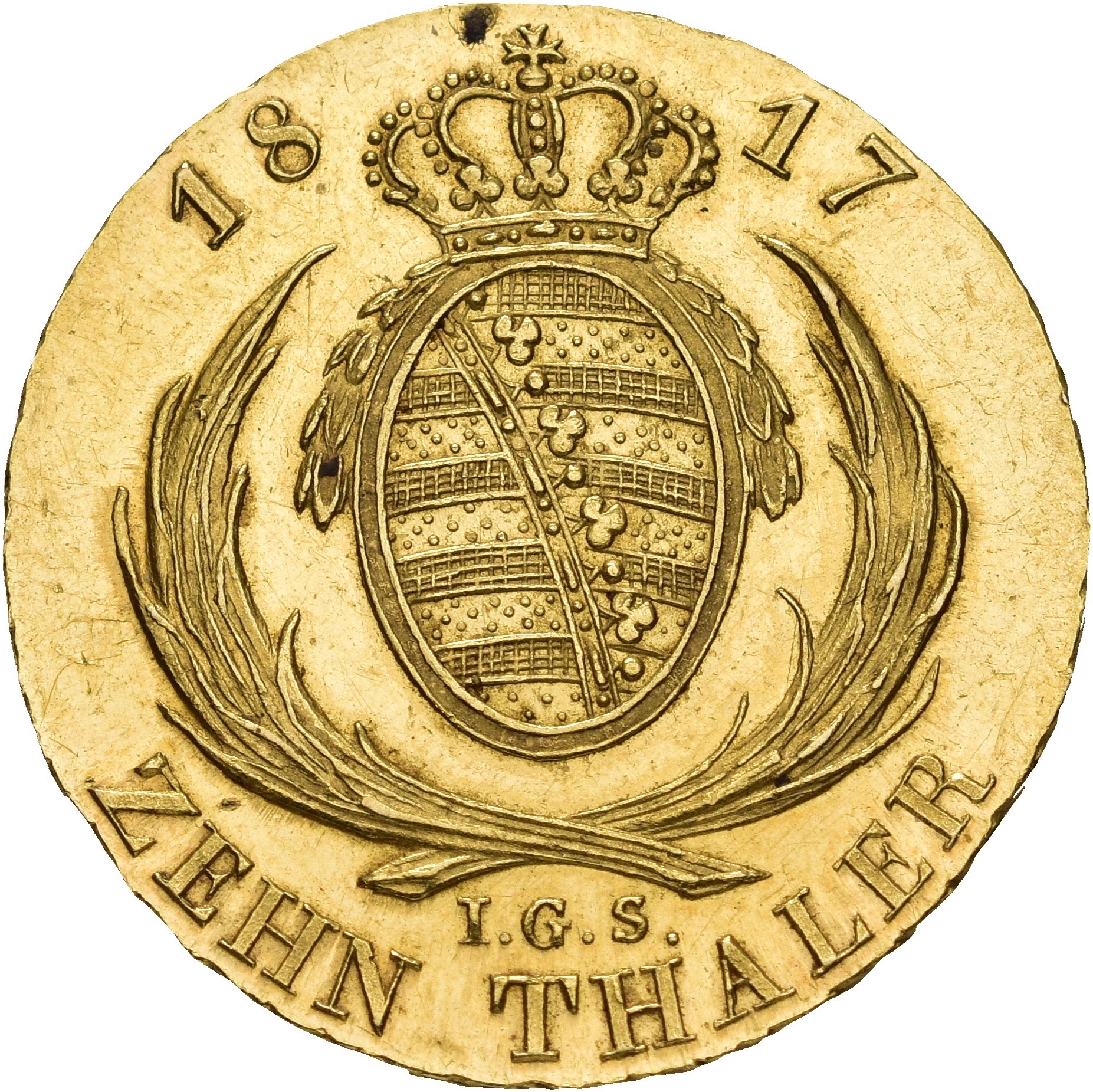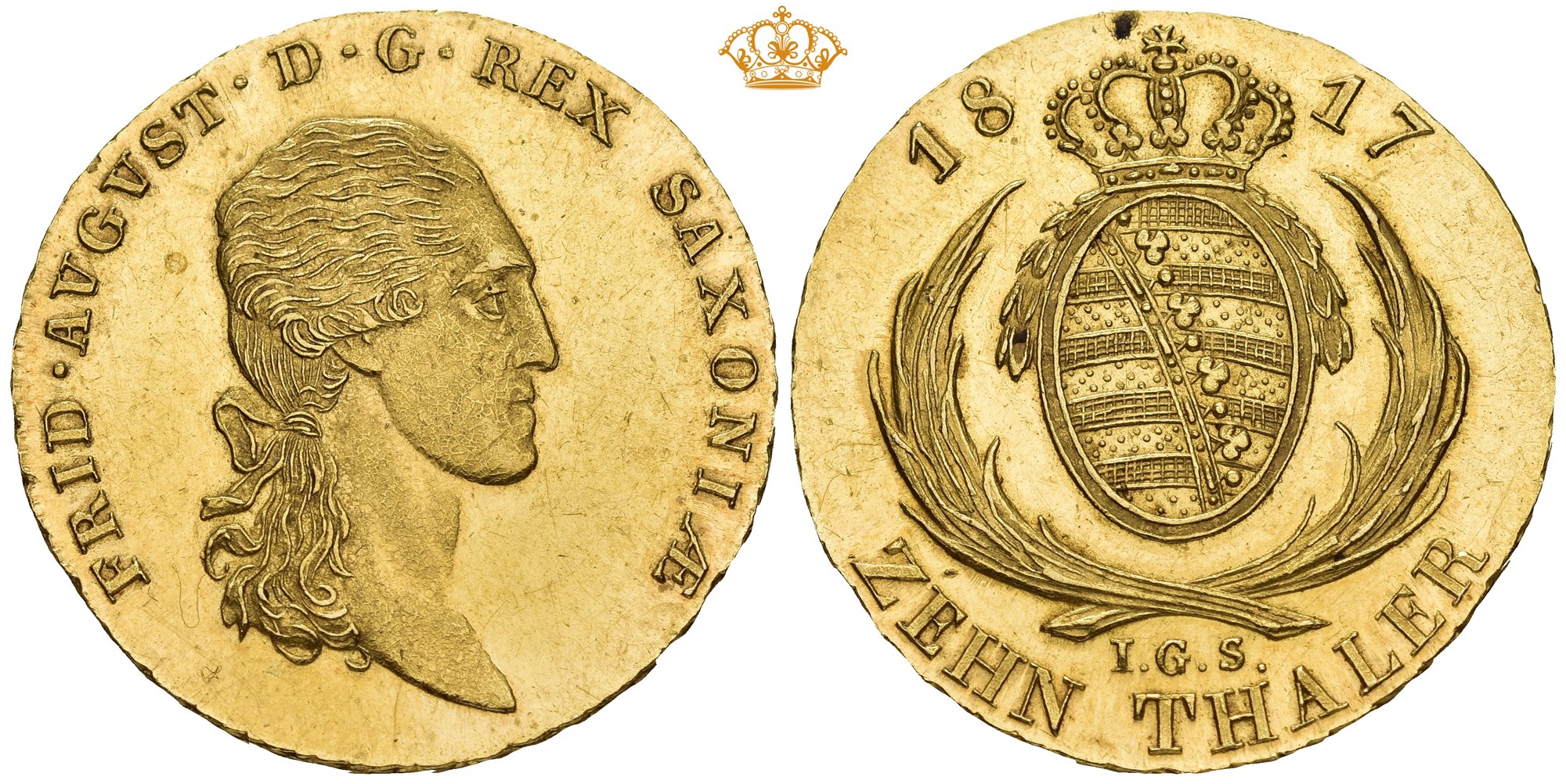10 Taler 1817 (Doppelter August d'or ), Dresden. 13,3 g. Mintmaster Johann Georg Studer. Bust right with tied hair. / Crowned coat of arms above crossed palm branches