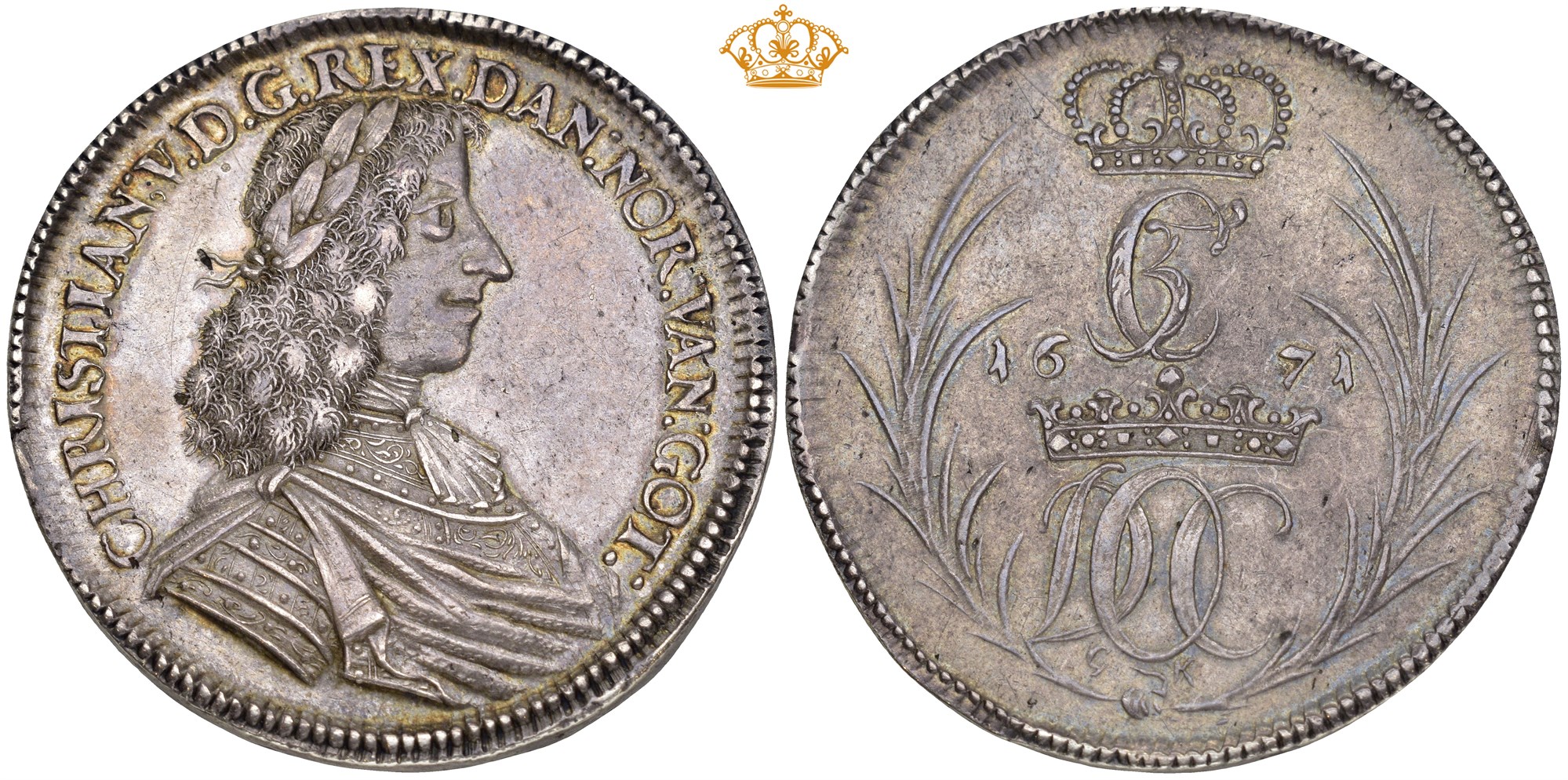 Speciedaler 1671, København. 29.72 g. Monteringsspor. Fint tonet eksemplar av denne sjeldne og interessante typen, som ble utmyntet for Det dansk ostindiske Compagni (DOC).