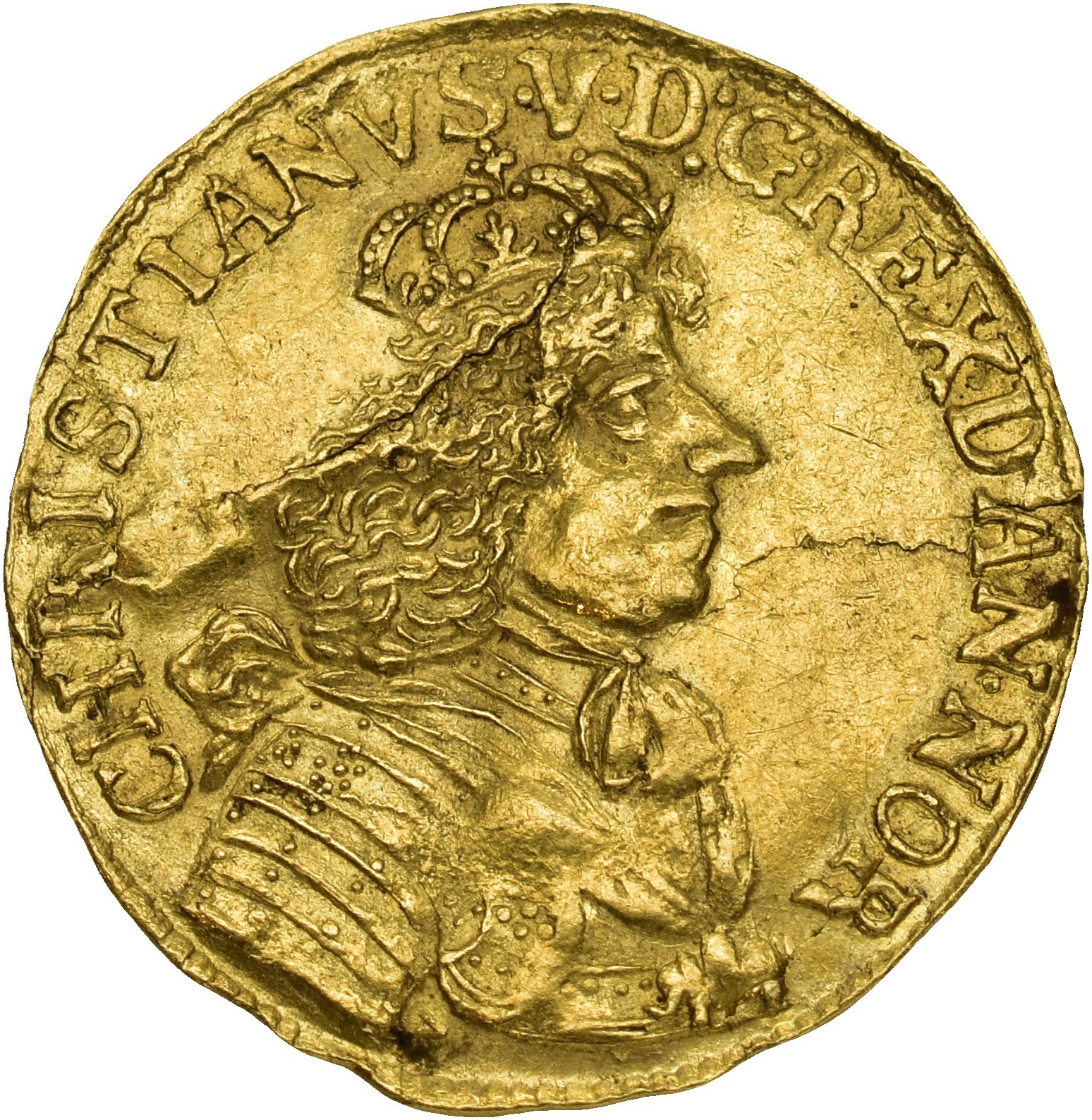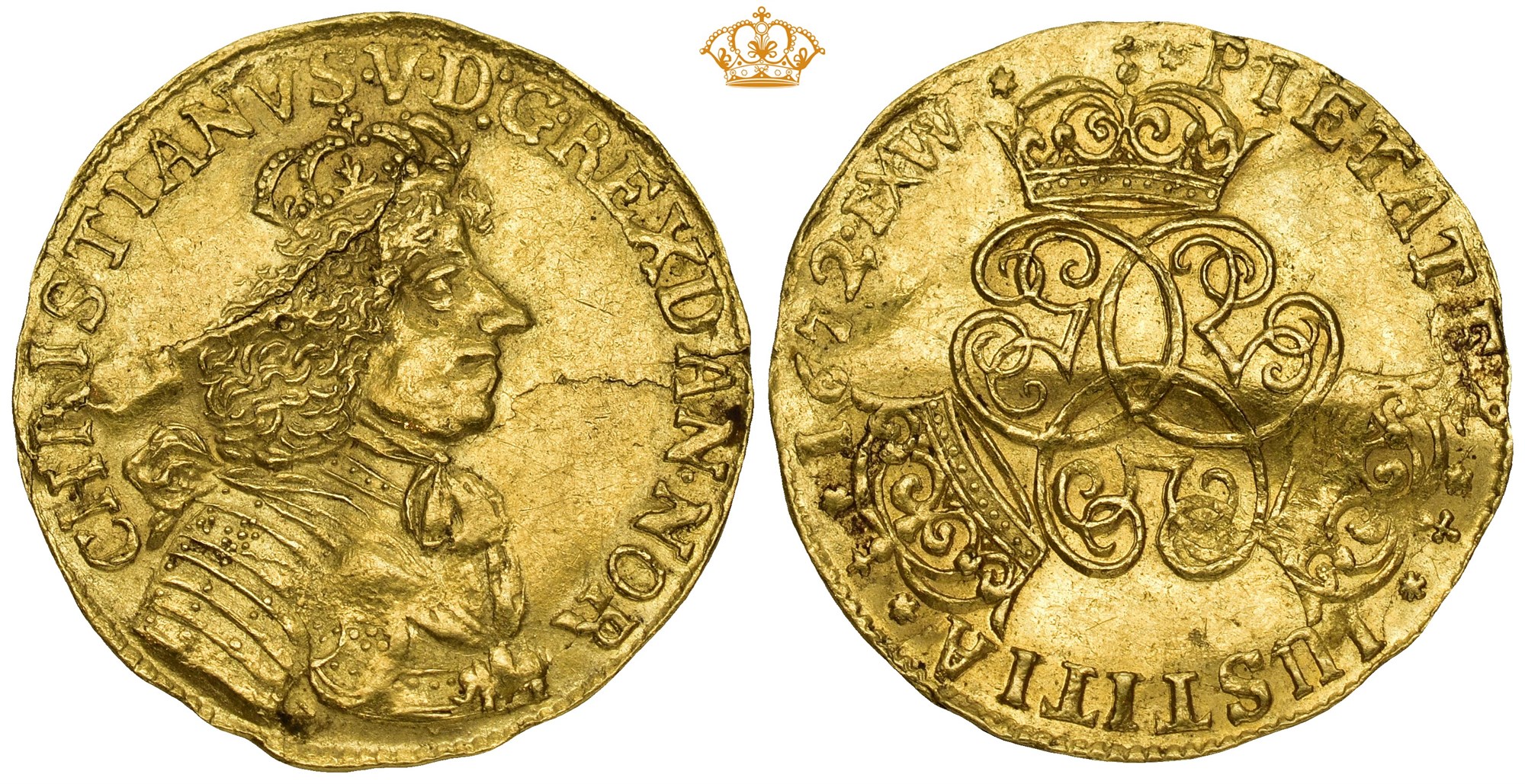 Dukat 1672, Glückstadt. 3.45 g. Buklet, blanketrevner. Sjelden dukattype preget under myntmester Johan Woltereck.