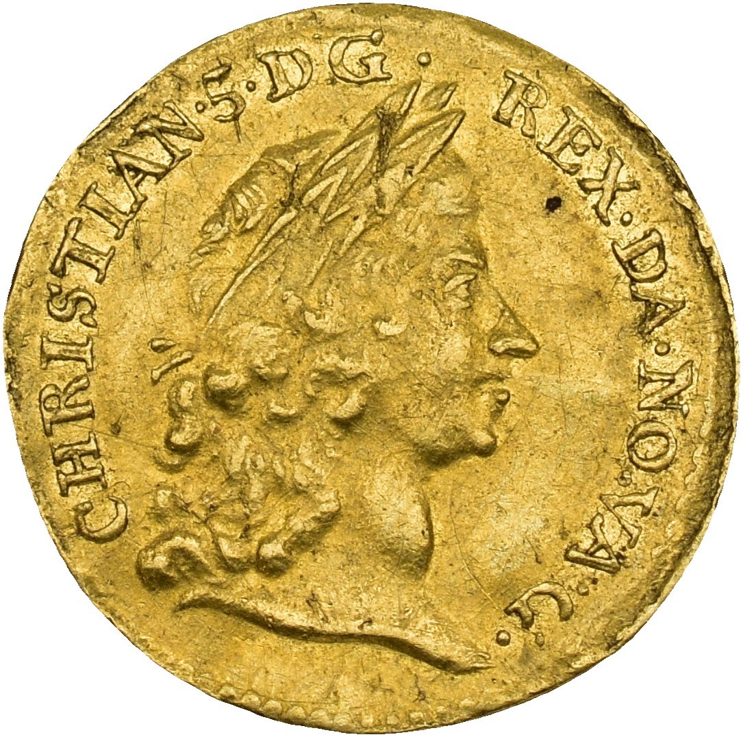 1/4 Dukat 1676, København. 0.90 g. Små riper, lett buklet. Fint eksemplar af sjelden typemynt.