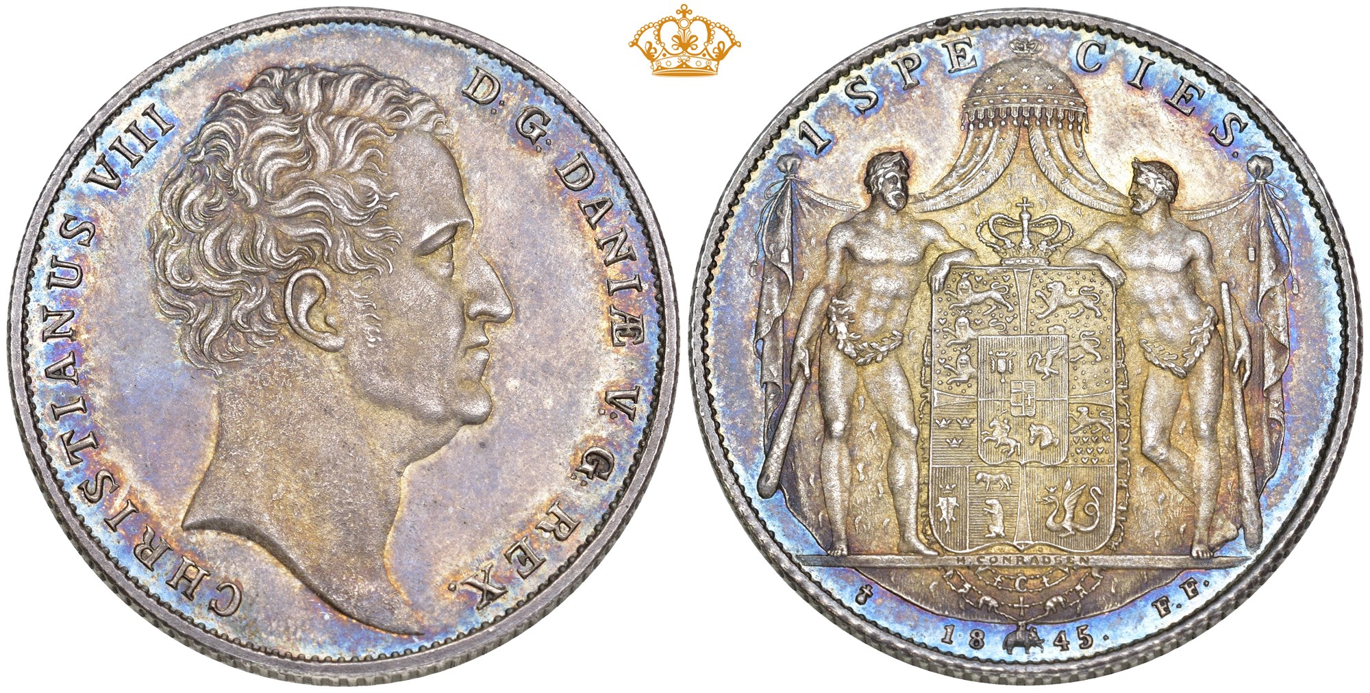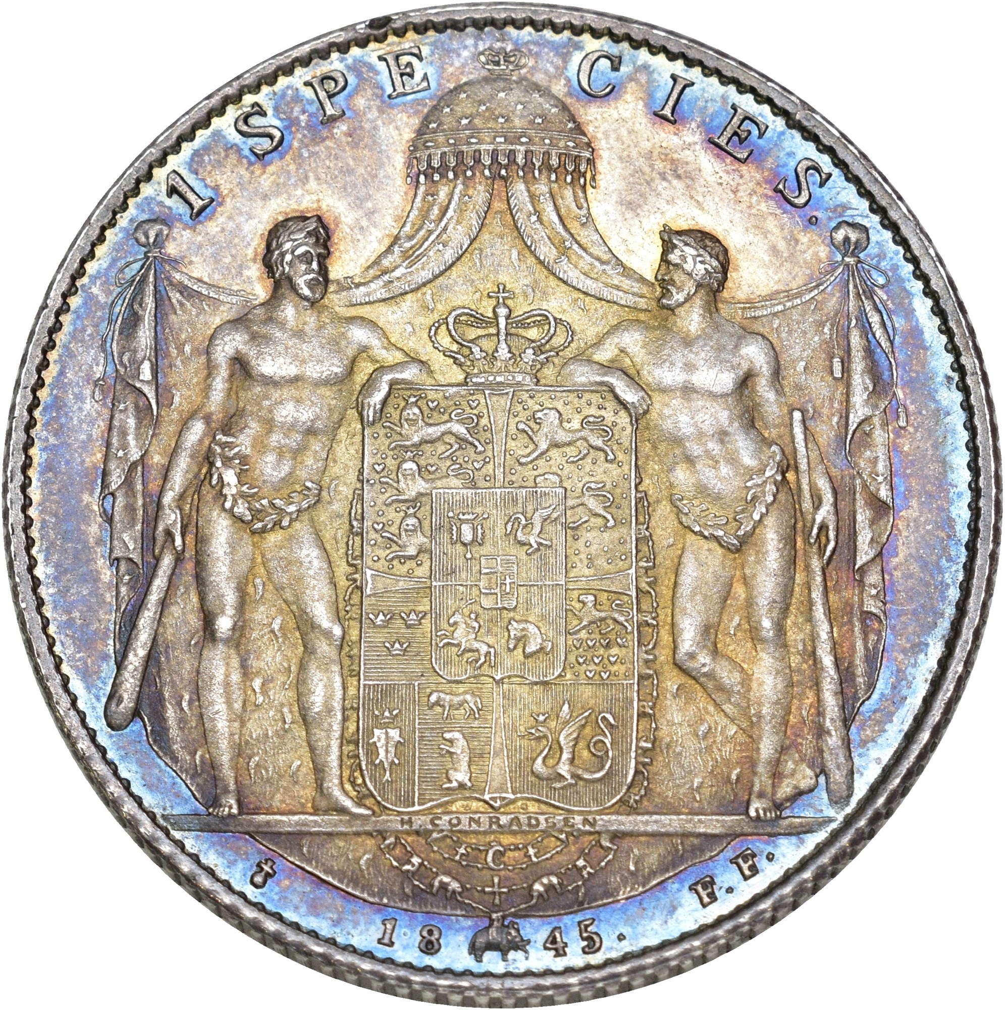 Speciedaler 1845 FF, Altona. 28.95 g. Hairlines. Nydelig tonet prakteksemplar.